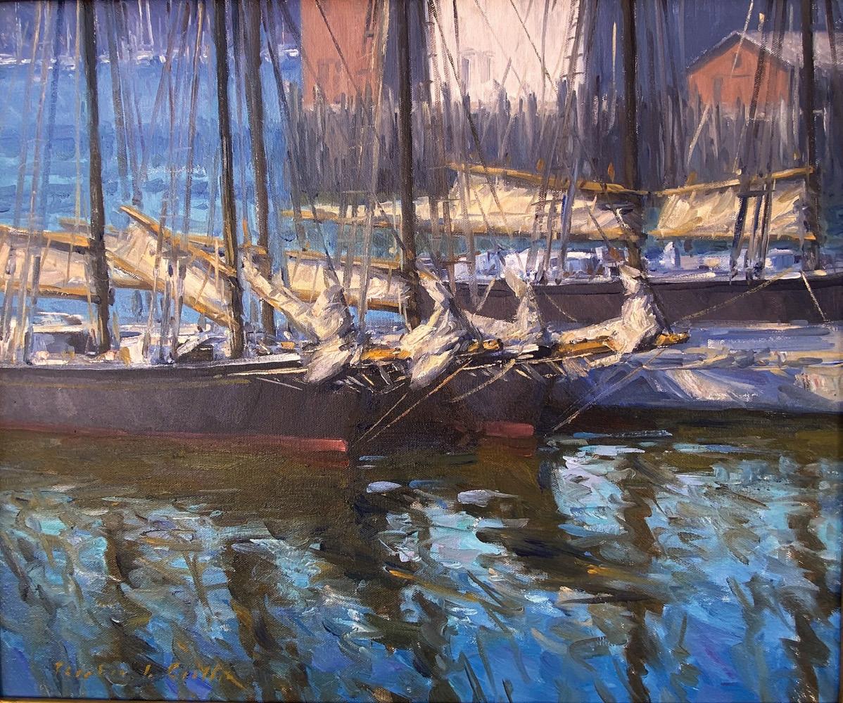 “In addition to our local landscapes, I paint the many boats that work the waters of our busy fishing community of Digby, as well as the elegant sailing boats that harbour here, or visit on occaision. I have always loved water—from early canoe trips to walks along the shore and getting my feet stuck in the tidal mud of the Bay of Fundy. Early in my painting journey I started painting boats as a way to paint water. The glistening reflections and sparkle that happens around a working dock are endlessly fascinting. I have grown to love the challenge of painting boats for the joy of depiciting the play of light across hulls, billowing canvas and intricate rigging.