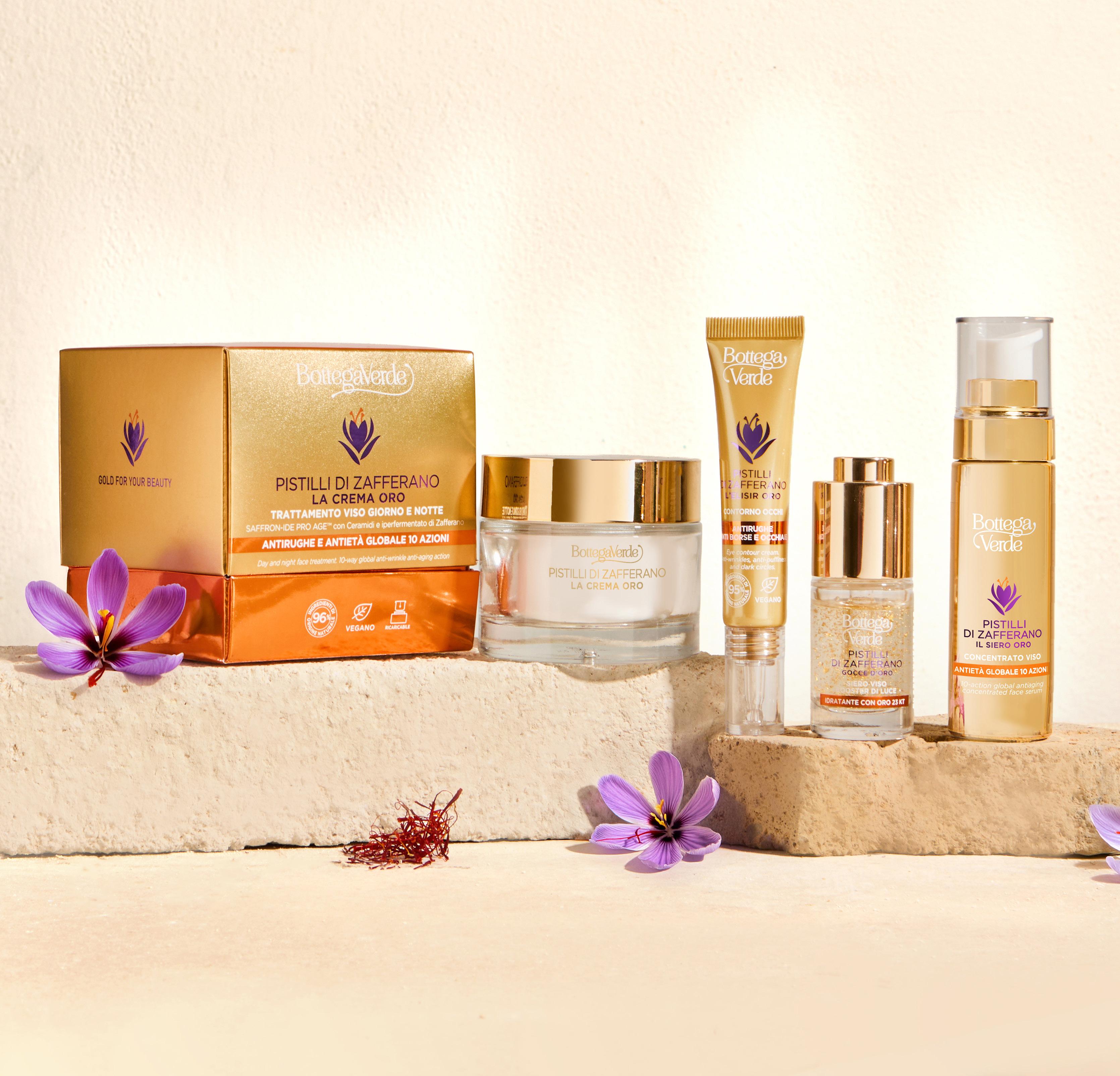 Born from the rarest of treasures, Tuscan-grown Saffron, and the scientific mastery of Bottega Verde Laboratories, Pistilli di zafferano is a cutting-edge skincare ritual where nature meets advanced biotechnology.