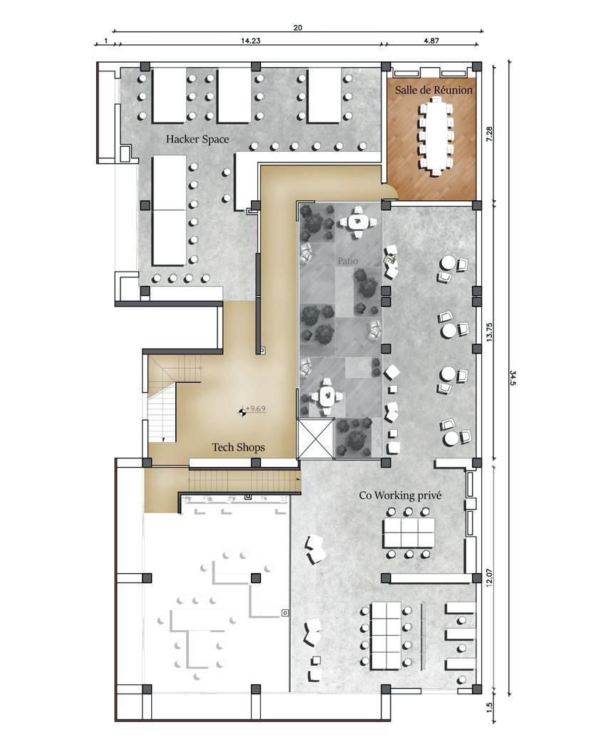 The ground floor has been allocated for public reception and administrative management areas. A portion of the project has been dedicated to urban elements. On the upper floors, we’ve organized the incubation activities based on the required flows. The penthouse level has been designated for accommodating the incubated ventures: six studios that open onto an accessible and furnished urban terrace.