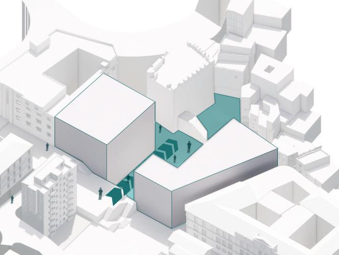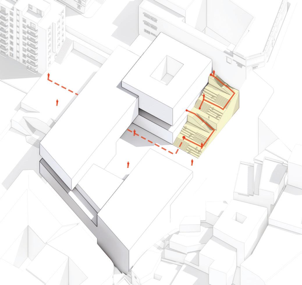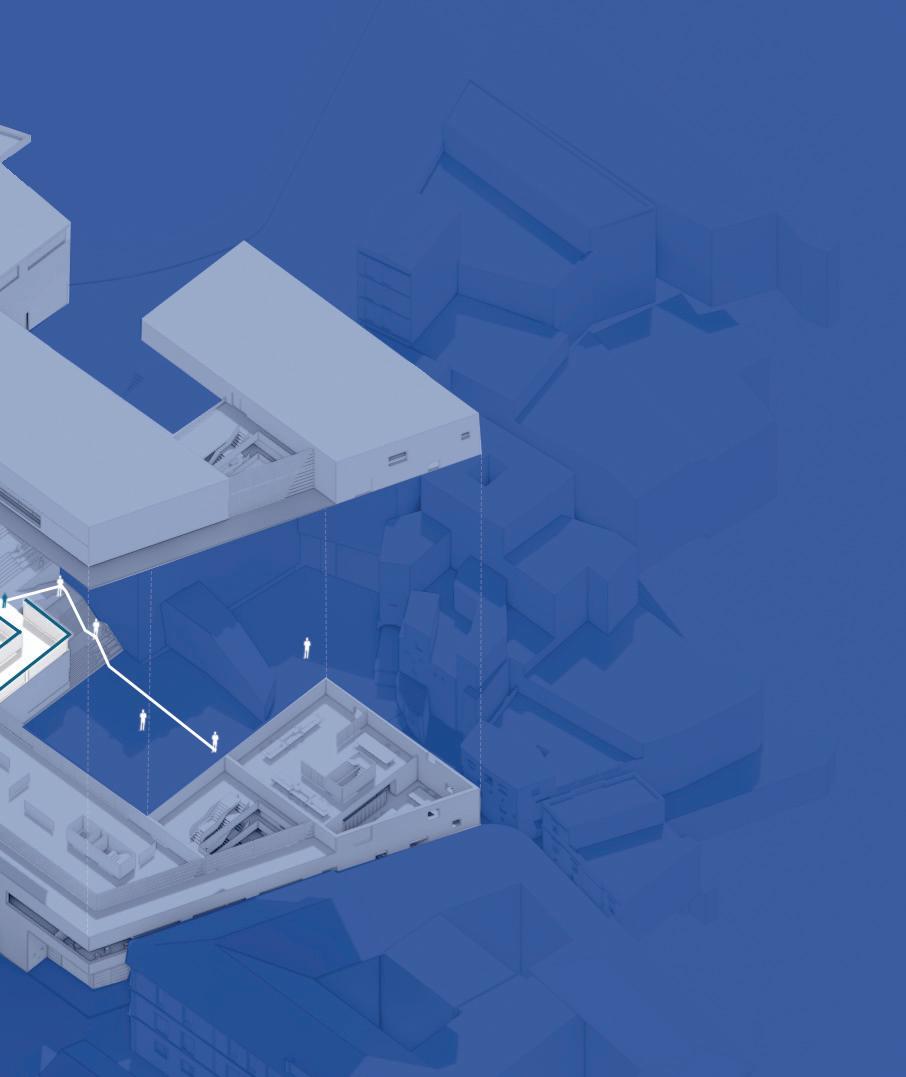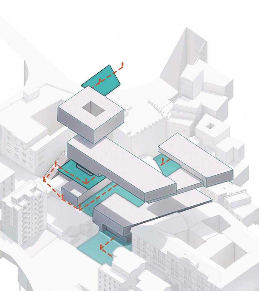 This layout allows for flexible movement within the space, promoting freedom of movement. Entrances to ground floor activities are situated at the level of the plaza, and inbetween halls separate flows on the upper levels.
