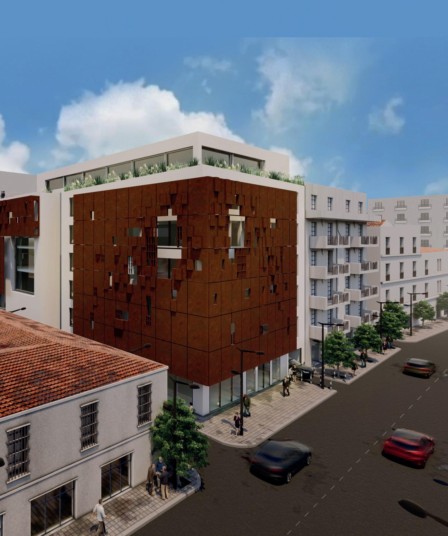 The façade facing Mohamed Belouezdad street carries echoes of the Art Deco building’s architectural elements and the design of its window module. The external skin is made of corten steel, showcasing the various stages of detachment and unveiling resulting from wear and tear.