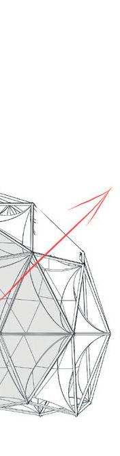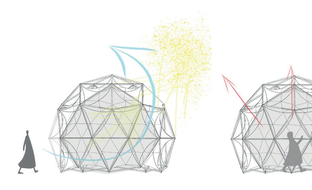 is translated into a triangular, flexible, and foldable structure that creates a geodesic dome with a parametric frequency, deriving its strength from the external tension applied.