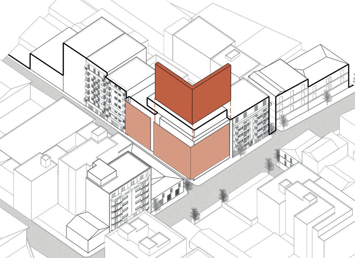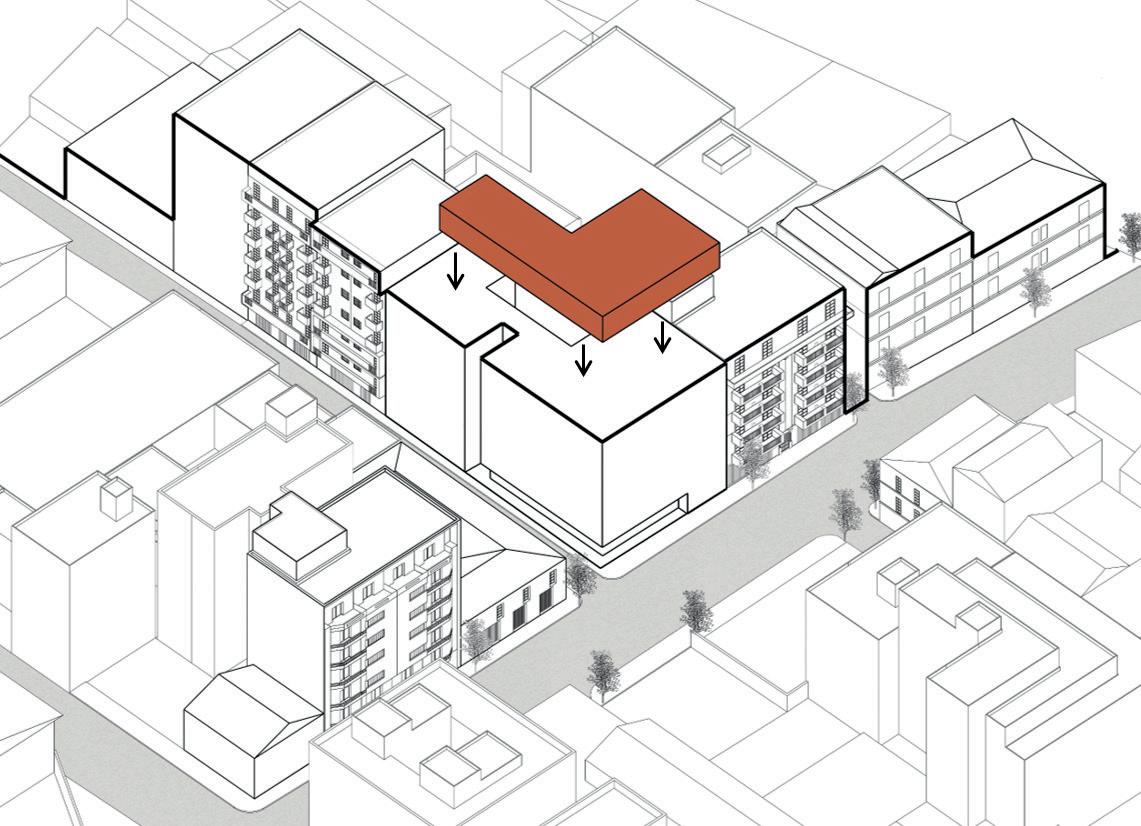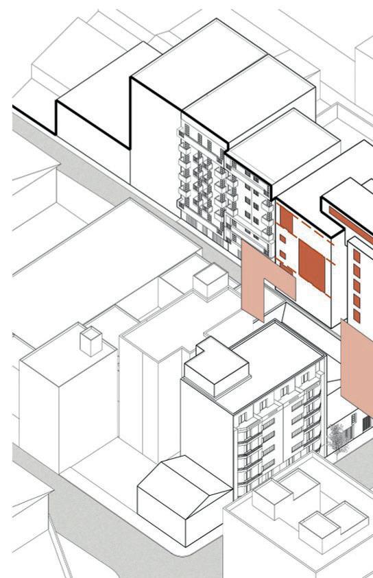 The execution of the project can be summarized in six steps, respecting the architecture and placement of adjacent buildings, their architectural styles, and dimensions. This results in an architecture that seamlessly blends with its surroundings while maintaining its uniqueness through these various approaches.