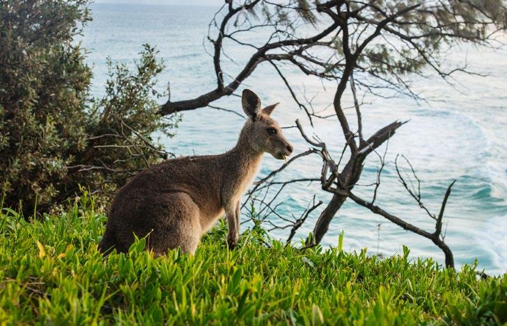 but the moment we arrive, the cars disperse as everyone heads to their favourite corner of the island. Straddie’s quiet roads lead to exquisite beaches where turquoise waves crash against the rocks and soft, white sand stretches for mile upon mile. At Cylinder Beach we watch dolphins dip and dive through the water, and returning to our car, we see kangaroos skirting quietly into the bush. Humpback whale sightings are also commonplace on Straddie, and road signs caution drivers to be on the lookout for koala crossings.