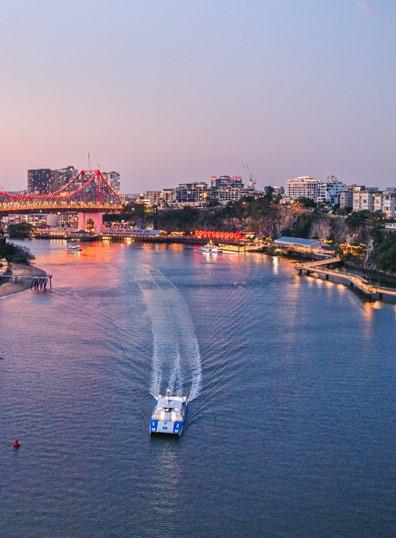 CityCat on Brisbane River with Story Bridge aerial and city views at dusk.