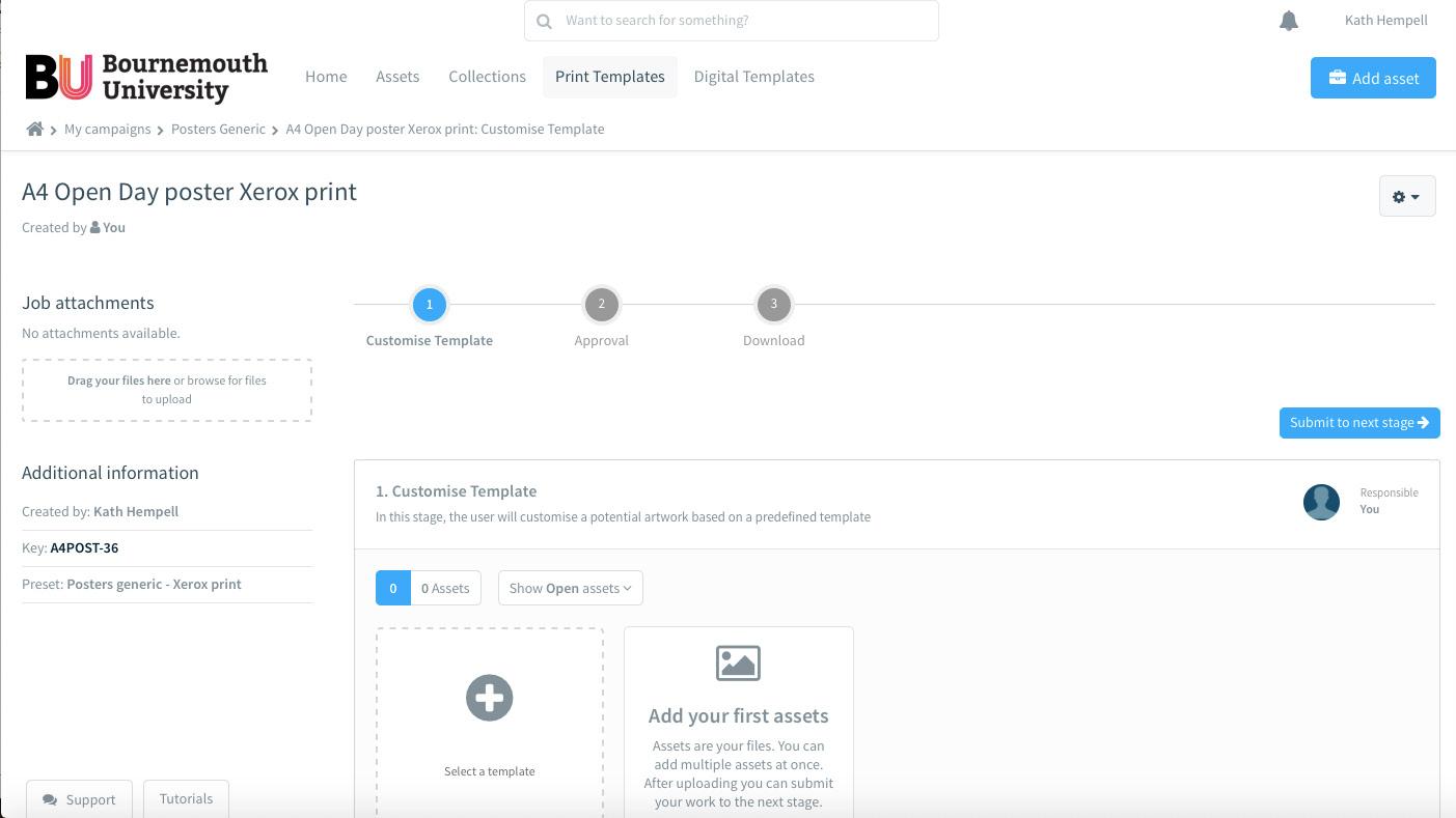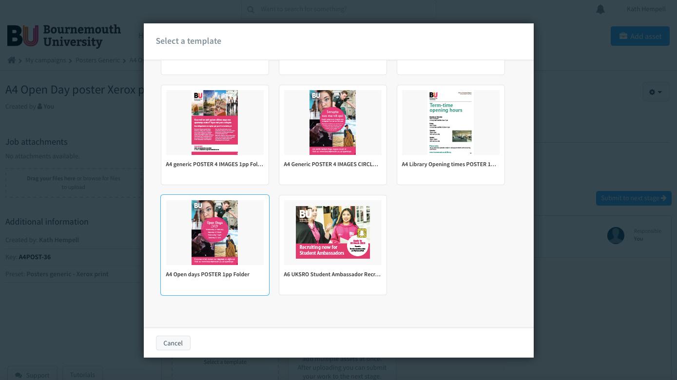 5. Customise your print asset. Click the + button. A screen with available templates will open. If the template you need is not available, contact the Design Team.