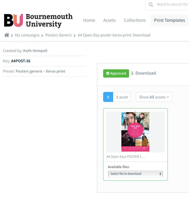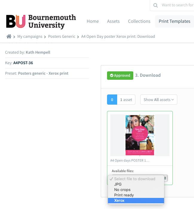 • You can decide on whether you want to print via Xerox workflow (where you will download a PDF and organise the print yourself via Xerox) or whether you want to print via the Design Team (where the Design Team provides quotes and organises print production and delivery).