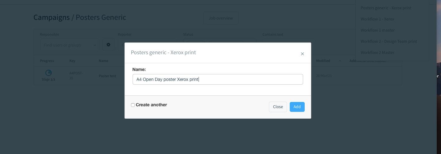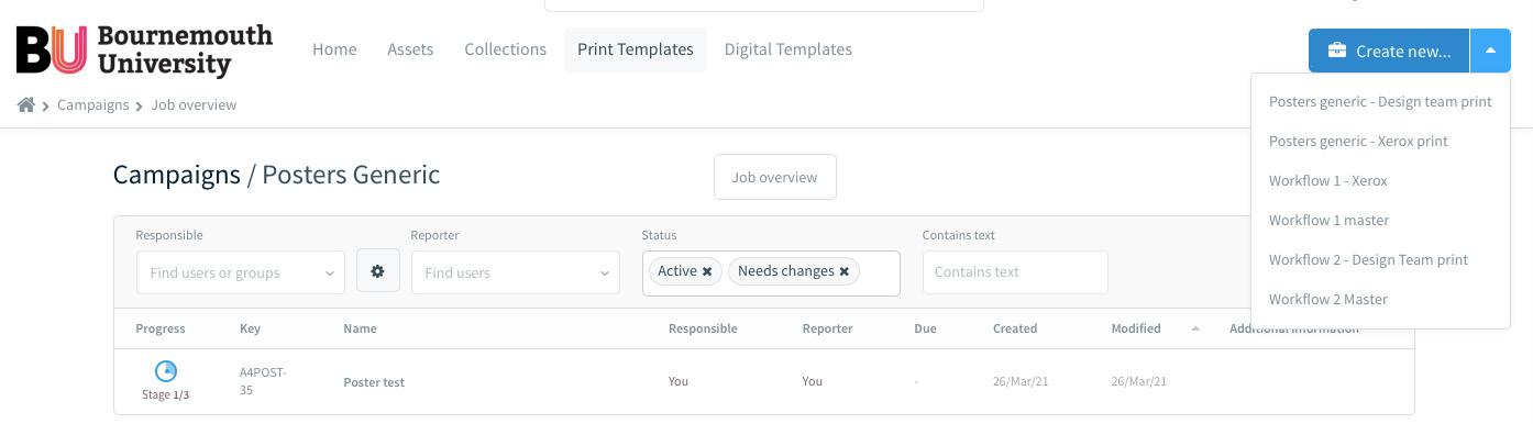 3. Click ‘Create new….’ button to select the workflow required (Design Team print OR Xerox print).
