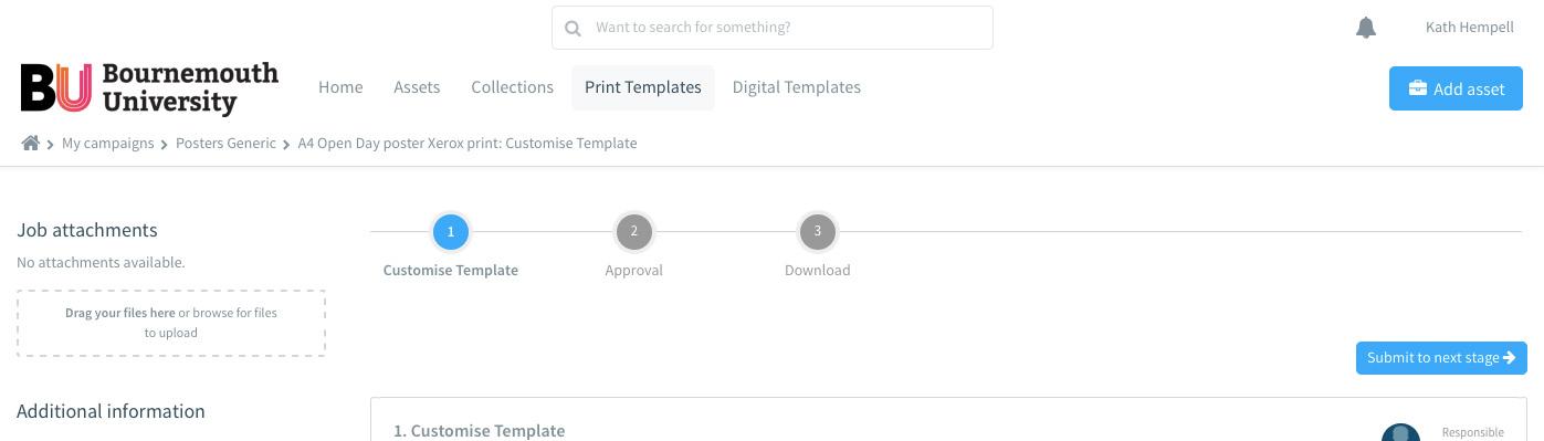 • Our Print Template module helps you manage the materials you want to print, customise them online with a simple editor, and upload so they can be reviewed and approved by the Design Team.