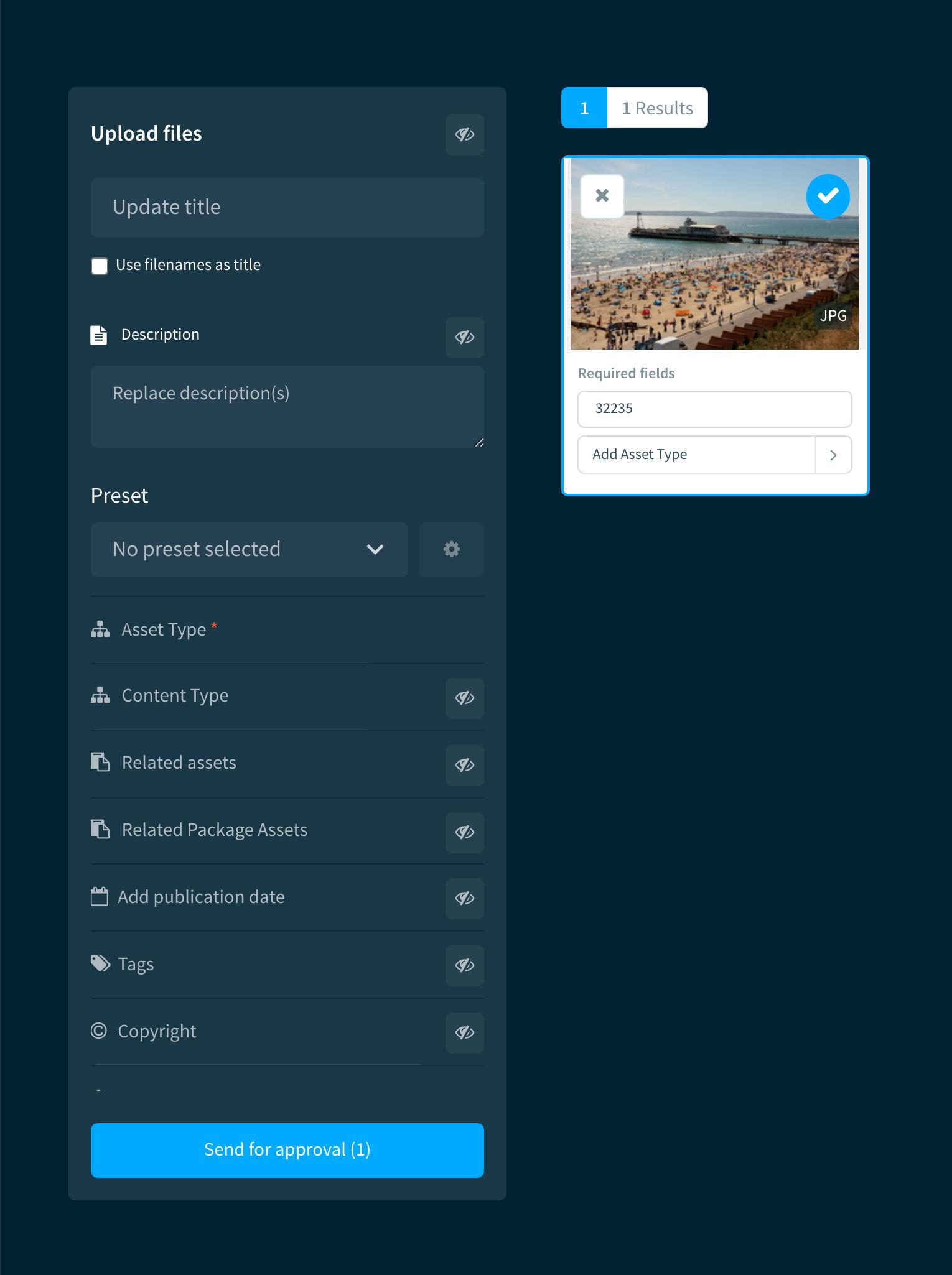 Once you’ve added the assets you want to upload, apply metadata to assets. This allows users to find them once they’re in the DAM.