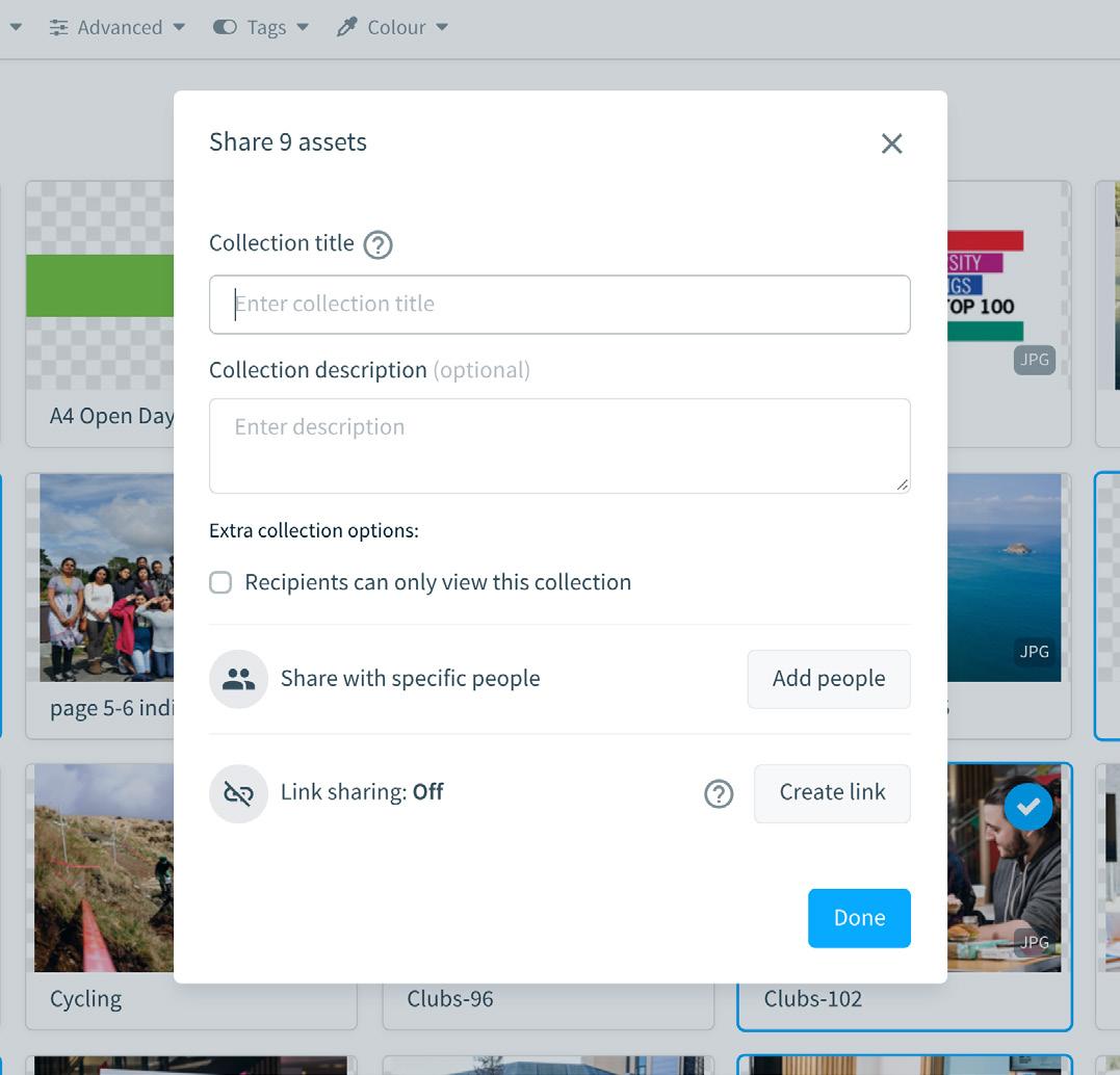 3. If you’d like to share the collection that you created, click on “Add People” and enter the email addresses and/or names with whom you’d like to share. You can add internal users or external parties that don’t have a Bynder login here.