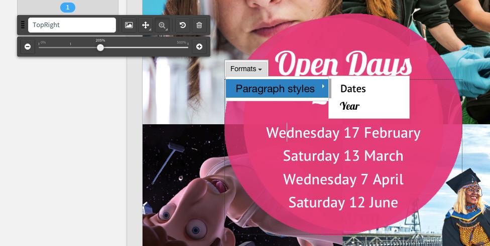 12. Amend your copy by clicking into the text boxes. The Format button shows the paragraph styles / fonts available