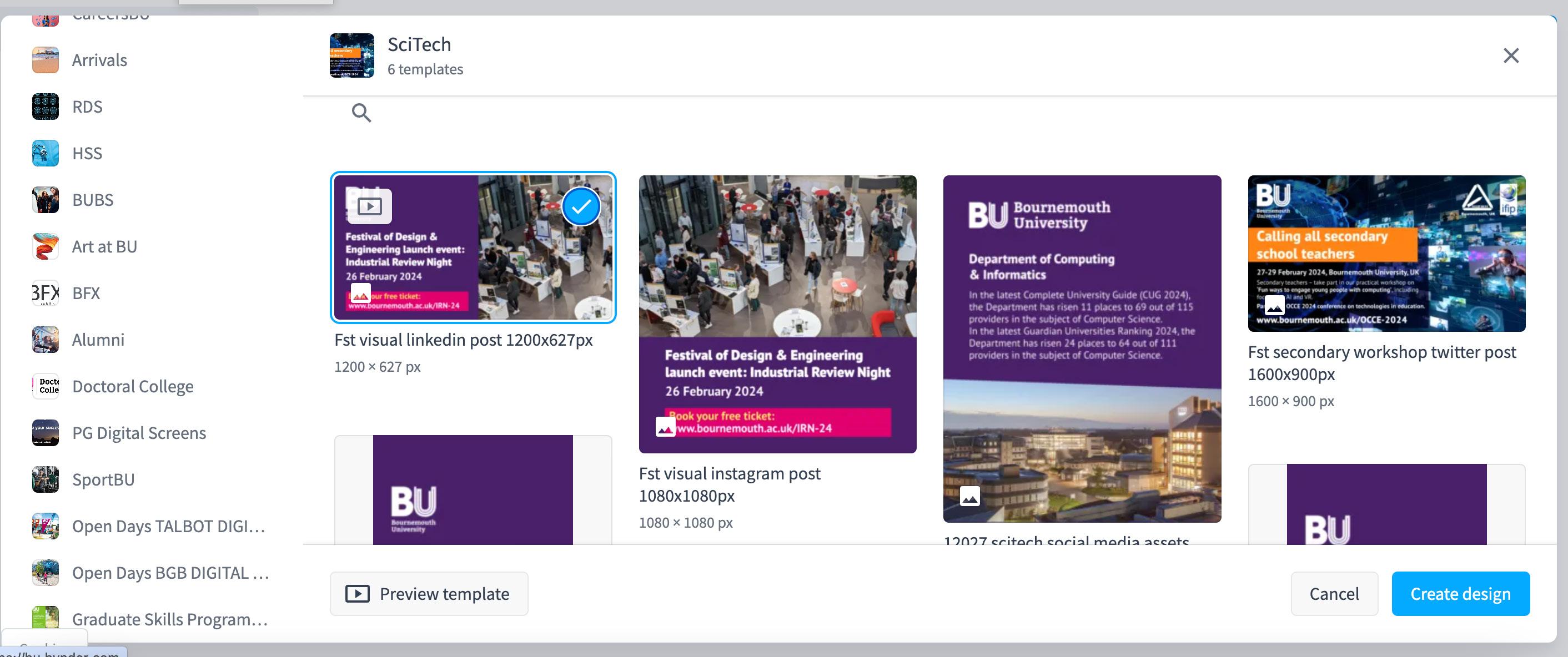 4. Find the design you want to create and click on its thumbnail. Click ‘Create design’ and the editor will open.