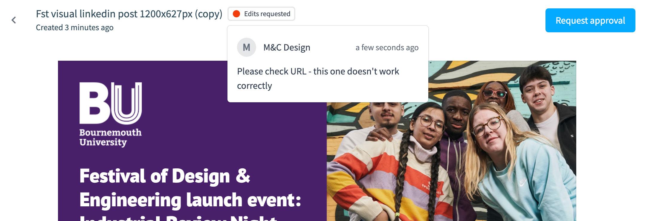 16. If edits are required, you will receive email notification from the design team. Your design will appear as ‘Edits requested’ with a red dot. Hover over the red dot to see the revisions required.