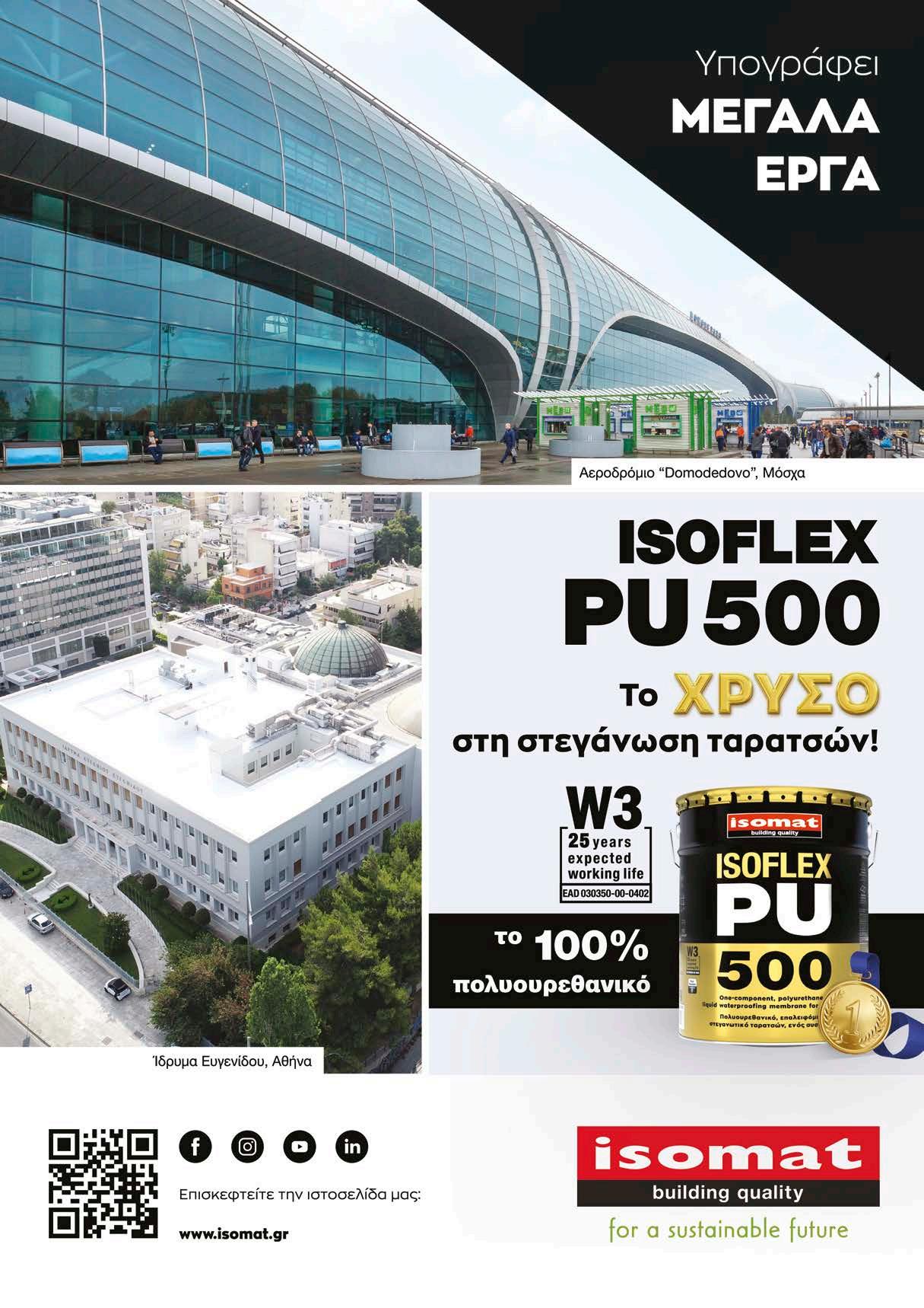 Center Τ.: 210 710 2452 Κωδικός ΕΛΤΑ: 21- 0183 ISSN 2732-6950 Εκδότης Μιχάλης Μπούσιας Διευθύντρια Περιοδικών Εκδόσεων Κατερίνα Πολυμερίδου Group Αdvertising Director Λήδα Πλατή Ετήσια Συνδρομή: €99 12 6 NEWS CONSTRUCTION CSR & ESG 7 ISOMAT: Πρωτοστάτης της Βιώσιμης Ανάπτυξης SPECIAL REPORTS 8 Στα 10 δισ. σκαρφάλωσε το ανεκτέλεστο των κατασκευαστών 12 Τα μεγάλα έργα του 2023: Όσα μπαίνουν σε φάση υλοποίησης 56 Κυβερνοέγκλημα: