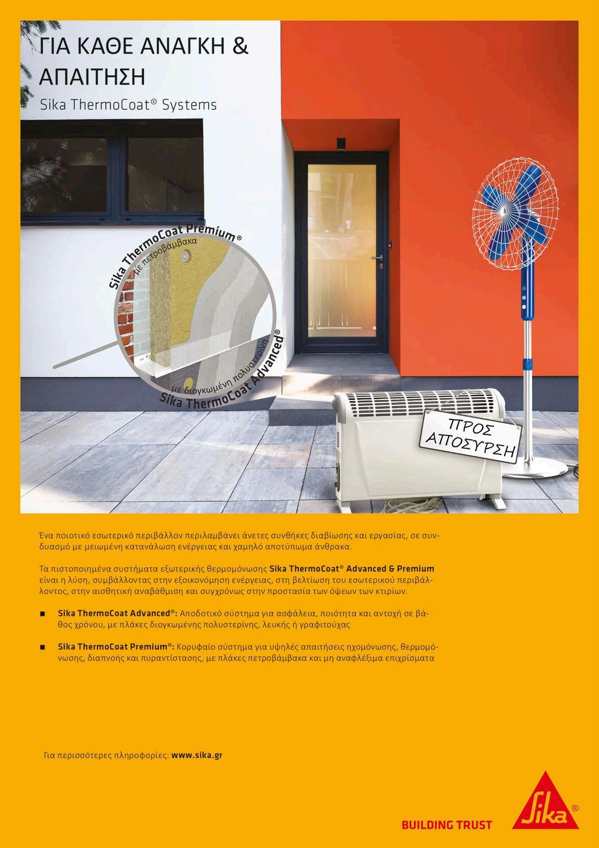 αστικών κέντρων, μειώνονται οι απορροές των υδάτων που είναι υπεύθυνες για τα έντονα πλυμμηρικά φαινόμενα, περιορίζεται η ηχορύπανση και απορροφάται σημαντικό μέρος των ατμοσφαιρικών ρύπων. Υπάρχουν τρία είδη πράσινων δωμάτων: ο εκτατικός που απαιτεί μικρή συντήρηση, ο ημιεντατικός που χρειάζεται περιοδική συντήρηση και ο εντατικός που θέλει τακτική συντήρηση. Η Sika παρέχει μία γκάμα προϊόντων που είναι πιστοποιημένη με FLL, η οποία αποτελεί τη σημαντικότερη σήμανση για τα πράσινα δώματα. Η στεγανοποίηση μπορεί να γίνει είτε με ασφαλτική μεμβράνη είτε με μεμβράνες ΤPO ή PVC, ενώ υπάρχουν ψεκαζόμενες μεμβράνες πολυουρίας και επαλειφόμενα συστήματα παρόμοια με το χρώμα. Η παρακολούθηση των δωμάτων για πιθανές διαρροές που μπορεί να βλάψουν μακροπρόθεσμα το κτίριο, γίνεται με ψηφιακά μέσα, τα οποία δείχνουν επακριβώς το σημείο της αυξημένης υγρασίας. Έτσι, εξοικονομείται χρόνος και περιορίζεται το κόστος συντήρησης. Για την επίτευξη του βέλτιστου αποτελέσματος, τα συστήματα στεγανοποίησης επιλέγονται πάντοτε σε συνεργασία με τις αρμόδιες εταιρείες δωμάτων.