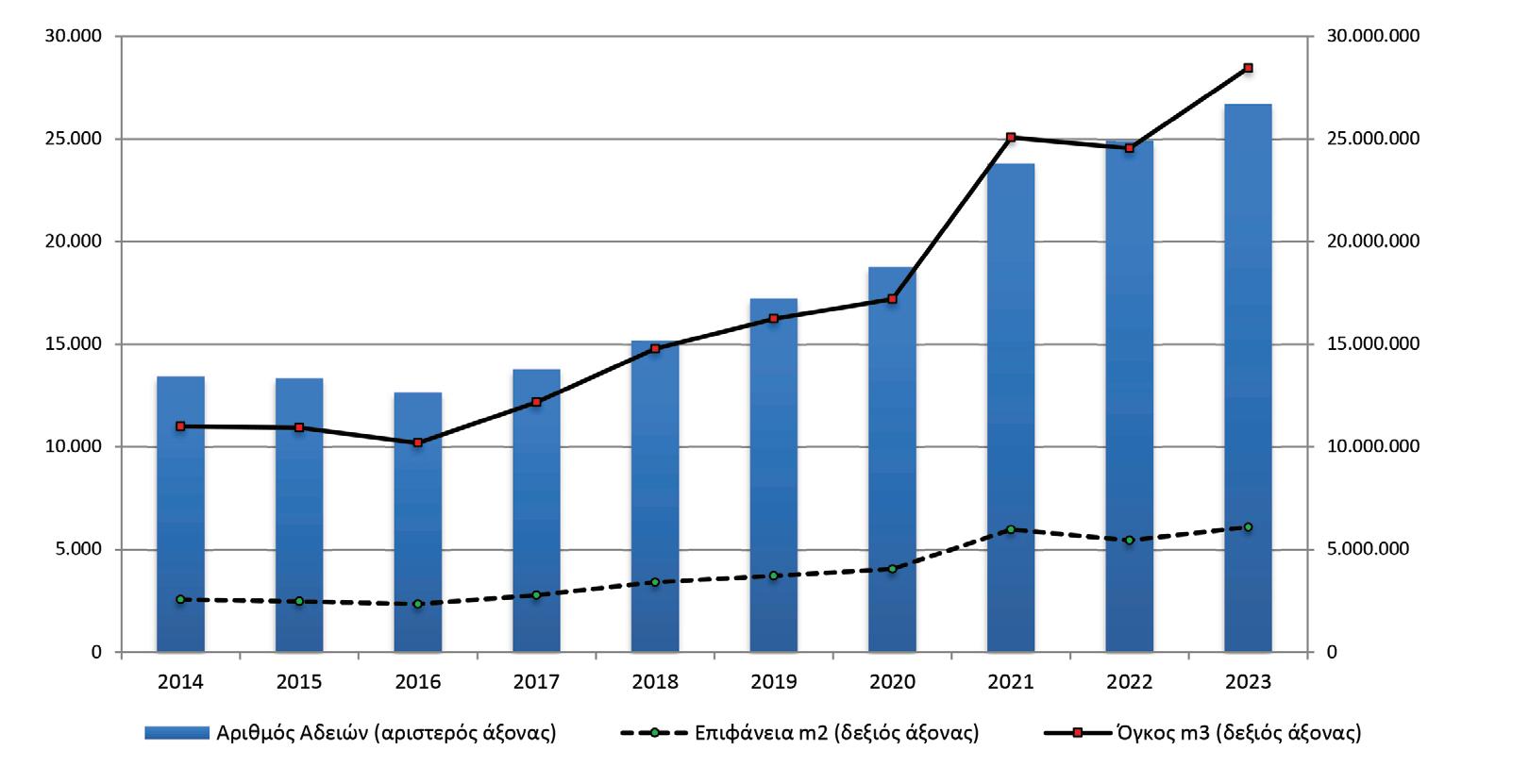 από τον Ιανουάριο 2023 έως τον Δεκέμβριο 2023, το μέγεθος της Συνολικής Οικοδομικής Δραστηριότητας (Ιδιωτικής-Δημόσιας) με βάση τις εκδοθείσες οικοδομικές άδειες, στο σύνολο της χώρας, ανήλθε σε 26.962 οικοδομικές άδειες, που αντιστοιχούν σε 6.238.016 m2 επιφάνειας και 29.171.122 m3 όγκου. Σε σχέση με την αντίστοιχη περίοδο του 2022 παρατηρήθηκε αύξηση κατά 7,1% στον αριθμό των οικοδομικών αδειών, αύξηση κατά 12,2% στην επιφάνεια και αύξηση κατά 16,0% στον όγκο. Κατά την ίδια χρονική περίοδο, ΙανουαρίουΔεκεμβρίου 2023, η Ιδιωτική Οικοδομική Δραστηριότητα εμφανίζει στο σύνολό της αύξηση κατά 7,2% στον αριθμό των εκδοθεισών αδειών, αύξηση κατά 11,9% στην επιφάνεια και αύξηση κατά 15,9% στον όγκο, σε σύγκριση με την αντίστοιχη περίοδο του 2022.