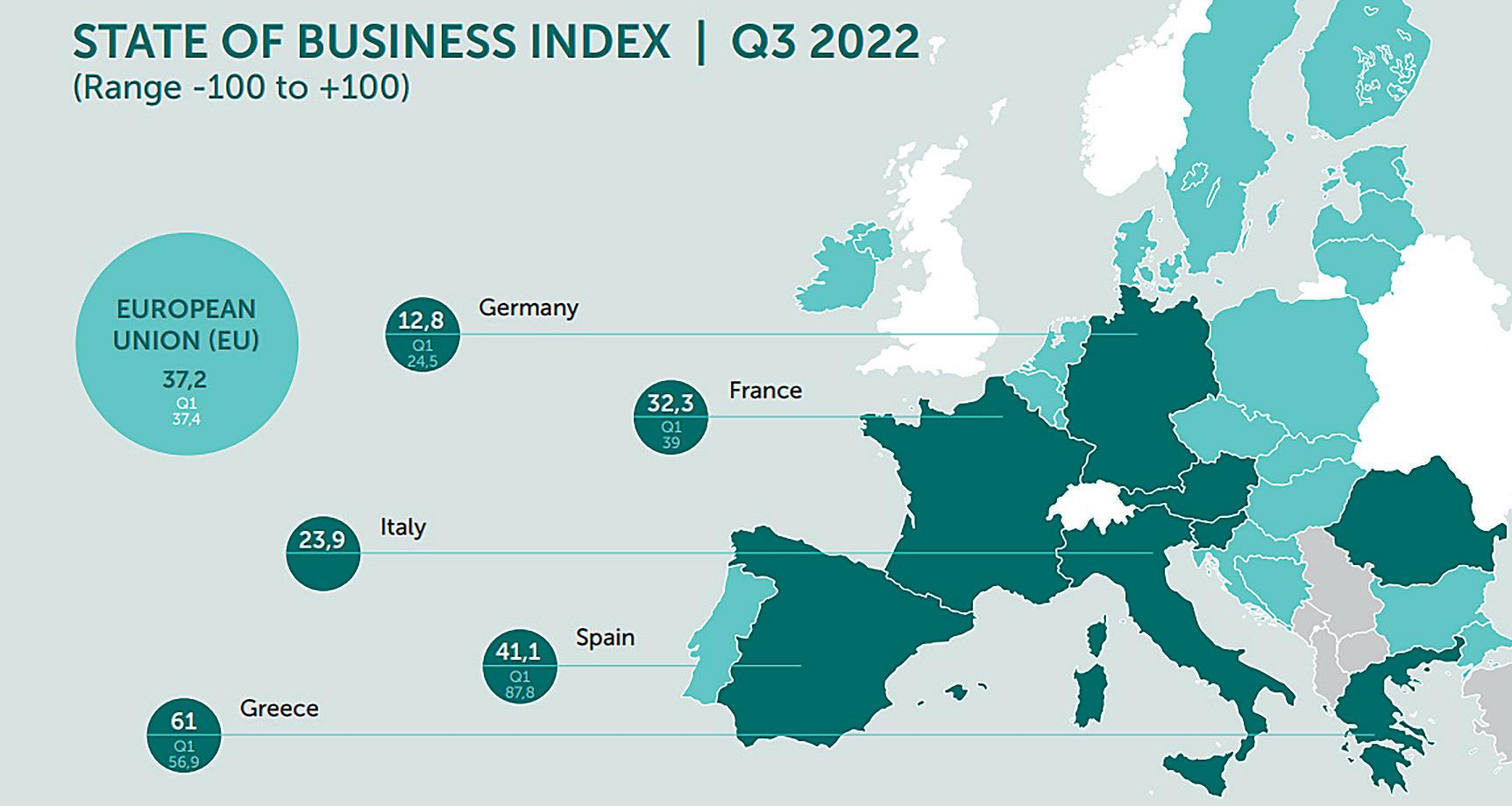 Τα αποτελέσματα αυτά αντικατοπτρίζουν την τρέχουσα αβέβαιη αγορά και την αναταραχή της Ευρώπης που προκλήθηκε από τον πόλεμο στην Ουκρανία και την ενεργειακή κρίση. Ωστόσο, η συμβουλευτική αγορά φαίνεται ότι αξιολογεί θετικά την κατάσταση τους επόμενους μήνες, εκτιμώντας ότι θα υπάρξει σημαντική βελτίωση. Οι Ιταλοί σύμβουλοι επιχειρήσεων βρίσκονται στην πρώτη θέση των θετικών προσδοκιών για την πορεία των συμβουλευτικών επιχειρήσεων το επόμενο εξάμηνο με ποσοστό 71,4%. Ακολουθούν οι Έλληνες σύμβουλοι επιχειρήσεων με ποσοστό 66,7% και οι Γάλλοι με 44,1%, ενώ οι Ισπανοί σύμβουλοι μάνατζμεντ είναι οι λιγότερο αισιόδοξοι για την αγορά το επόμενο διάστημα.