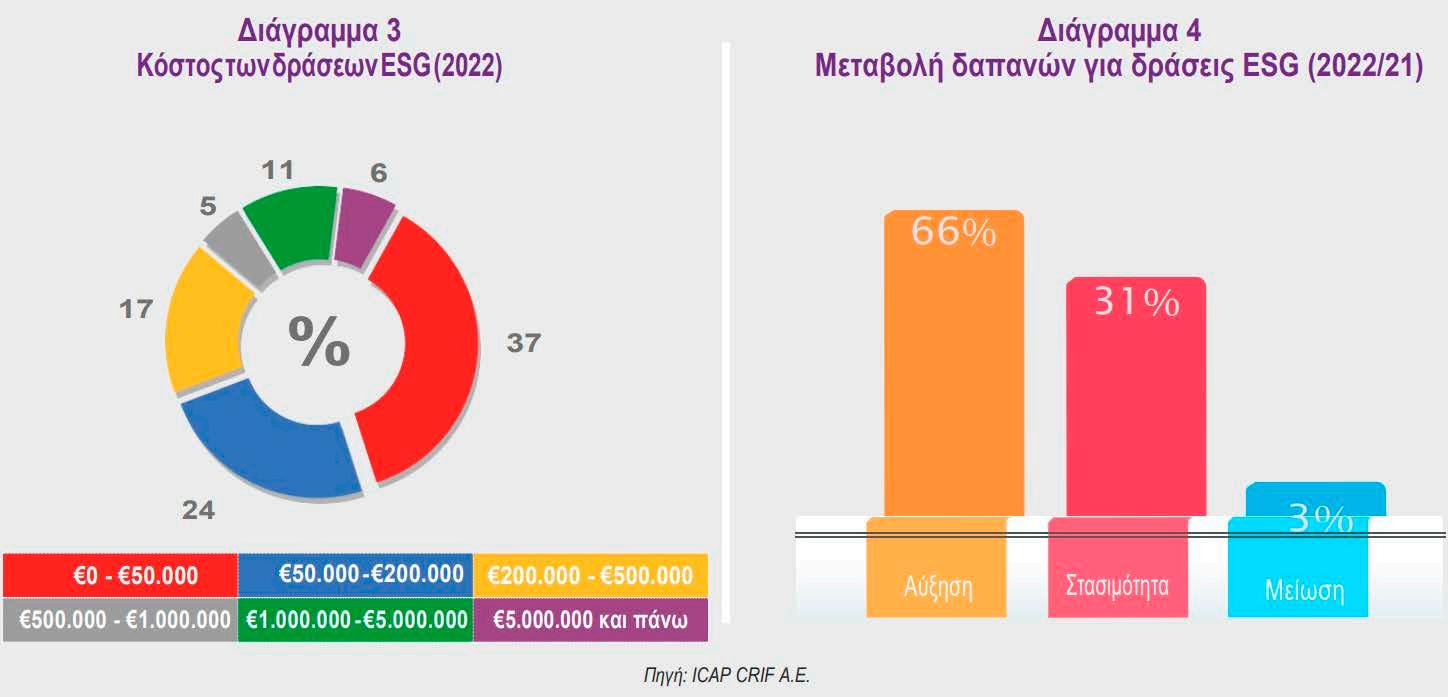 το 6% των εταιρειών του δείγµατος (Διάγραµµα 3). Από την επεξεργασία των απαντήσεων των συµµετεχόντων προκύπτει άµεση συσχέτιση του συνολικού κύκλου εργασιών τους µε τα ποσά που δαπανούν για τη βιώσιµη ανάπτυξη. Ενθαρρυντικό είναι το γεγονός ότι το 66% των επιχειρήσεων αύξησαν τις δαπάνες για ενέργειες ESG το 2022 (Διάγραµµα 4) συγκριτικά µε το 2021, ενώ µόλις το 3% των συµµετεχόντων δήλωσε ότι τις περιόρισε έναντι του προηγούµενου έτους.