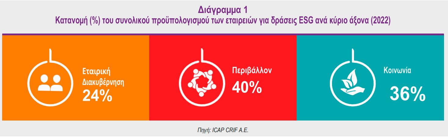 Η Διεύθυνση Οικονοµικών - Κλαδικών Μελετών της ICAP CRIF Α.Ε. διεξήγαγε έρευνα για τη Βιώσιµη Ανάπτυξη και τις Δράσεις ESG, στα πλαίσια της οποίας διερευνήθηκε η κατανοµή του συνολικού προϋπολογισµού των εταιρειών για δράσεις ESG, στους βασικούς πυλώνες: Περιβάλλον, Κοινωνία, Εταιρική Διακυβέρνηση. «Οι τελευταίες εξελίξεις με την ενεργειακή κρίση και τον πόλεμο στην Ουκρανία κατέστησαν ακόμα πιο αναγκαία και επιτακτική για τις εταιρείες την αναπροσαρμογή των επιχειρηματικών τους μοντέλων και της στρατηγικής τους στη βάση των κριτηρίων ESG, ώστε να ανταποκριθούν στις σημερινές προκλήσεις», σημειώνει στην εισαγωγική του δήλωση ο Νικήτας Κωνσταντέλλος, Προέδρος & CEO της ICAP CRIF. Είναι χαρακτηριστικό ότι το 95% των επιχειρήσεων που συμμετείχαν στην έρευνα, αναγνωρίζουν τη σημαντικότητα της Βιώσιμης Ανάπτυξης και της Εταιρικής Υπευθυνότητας χαρακτηρίζοντάς την ως «πολύ» ή «πάρα πολύ» σημαντική, με σχεδόν 7 στις 10 επιχειρήσεις να δηλώνουν ότι δαπάνησαν υψηλότερα ποσά για την υλοποίηση πρακτικών ESG το 2022 συγκριτικά με το 2021. Ωστόσο, οι εταιρείες κρίνουν ότι υπάρχουν ακόμα περιθώρια ανάπτυξης των δράσεων ESG, αφού το 55% θεωρεί ότι ο βαθμός διείσδυσης/εφαρμογής των σχετικών πρακτικών κυμαίνεται σε μέτρια επίπεδα. Η πλειονότητα των επιχειρήσεων θεωρεί τη δημιουργία μακροπρόθεσμης αξίας για όλα τα ενδιαφερόμενα μέρη και την ευρύτερη οικονομία (93%), καθώς και την ενίσχυση της εταιρικής εικόνας (92%), ως τα κυριότερα οφέλη που αποκομίζουν από την υιοθέτηση δράσεων ESG. Τα κονδύλια για το περιβάλλον των εταιρειών καλύπτουν το μεγαλύτερο μερίδιο (40%) στο συνολικό προϋπολογισμό των εταιρειών για τις δράσεις βιώσιμης ανάπτυξης - ESG, ακολουθούν οι δράσεις που σχετίζονται με την κοινωνία (36%) και οι ενέργειες που αφορούν την εταιρική διακυβέρνηση (24%) (Διάγραμμα 1).