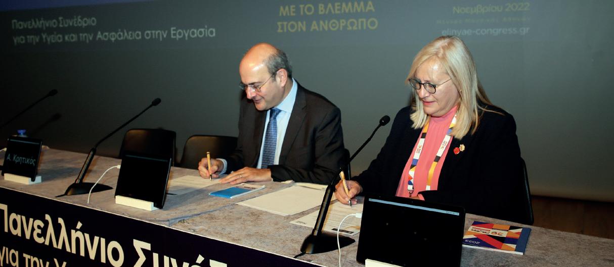 με συγκεκριμένες δράσεις, της νέας Εθνικής Στρατηγι κής για την Υγεία και την Ασφάλεια στην Εργασία, και τη λειτουργία του νέου Ολοκληρωμένου Πληροφορι ακού Συστήματος «ΗΡΙΔΑΝΟΣ» για την Υγεία και την Ασφάλεια στην Ερ γασία, εξήγγειλε ο υπ. Εργασίας. Το νέο σύστημα θα υλοποιηθεί με χρη ματοδότηση από το Ταμείο Ανάκαμ ψης, ενώ η διαγωνιστική διαδικασία ήδη έχει ξεκινήσει. Στο πλαίσιο του συνεδρίου υπεγράφη σύμφωνο συ