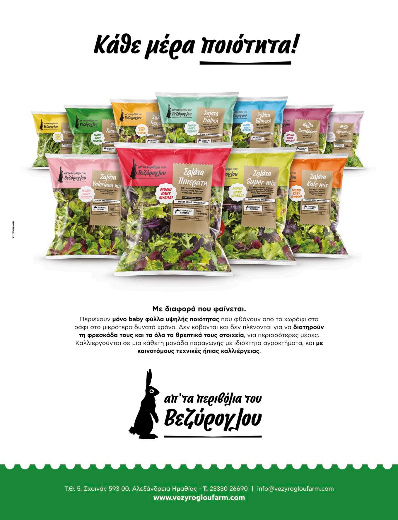 Ακόμη ένα προϊόν σαλάτας προστίθεται στη γκάμα της εταιρείας Βεζύρογλου. Πρόκειται για την Ελληνική Σαλάτα που περιέχει baby φύλλα πράσινου και κόκκινου μαρουλιού, άγριας ρόκας, σπανακιού και παντζαριού, που οφείλει την ιδιαίτερη γεύση της ακριβώς στην περιεκτικότητά της στα baby φύλλα παντζαριού. Όπως και τα υπόλοιπα προϊόντα της σειράς, η Ελληνική Σαλάτα δεν περιέχει συντηρητικά και τα λαχανικά που περιέχονται προέρχονται από την περιοχή της Ημαθίας όπου καλλιεργούνται με τεχνικές «ήπιας καλλιέργειας».