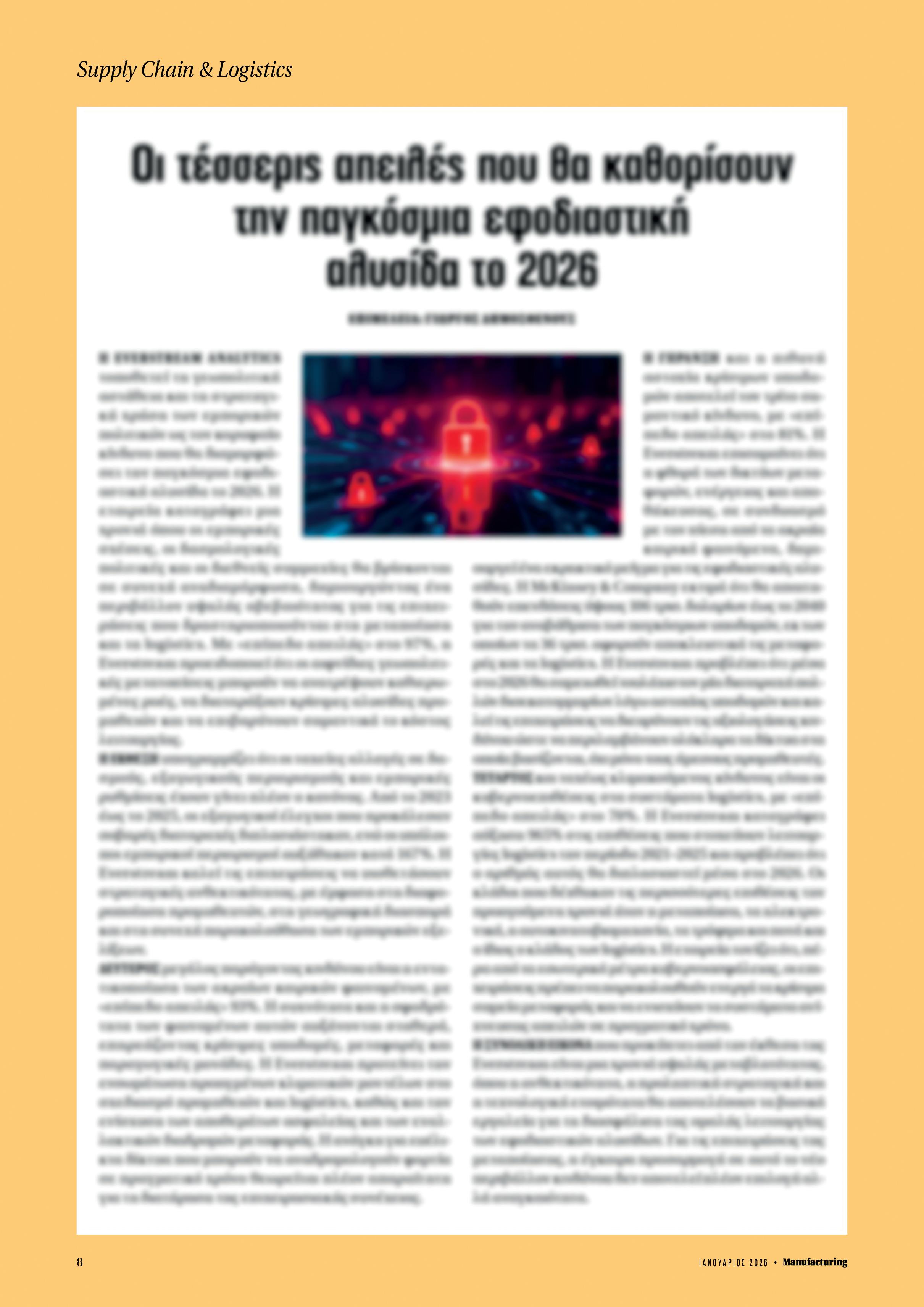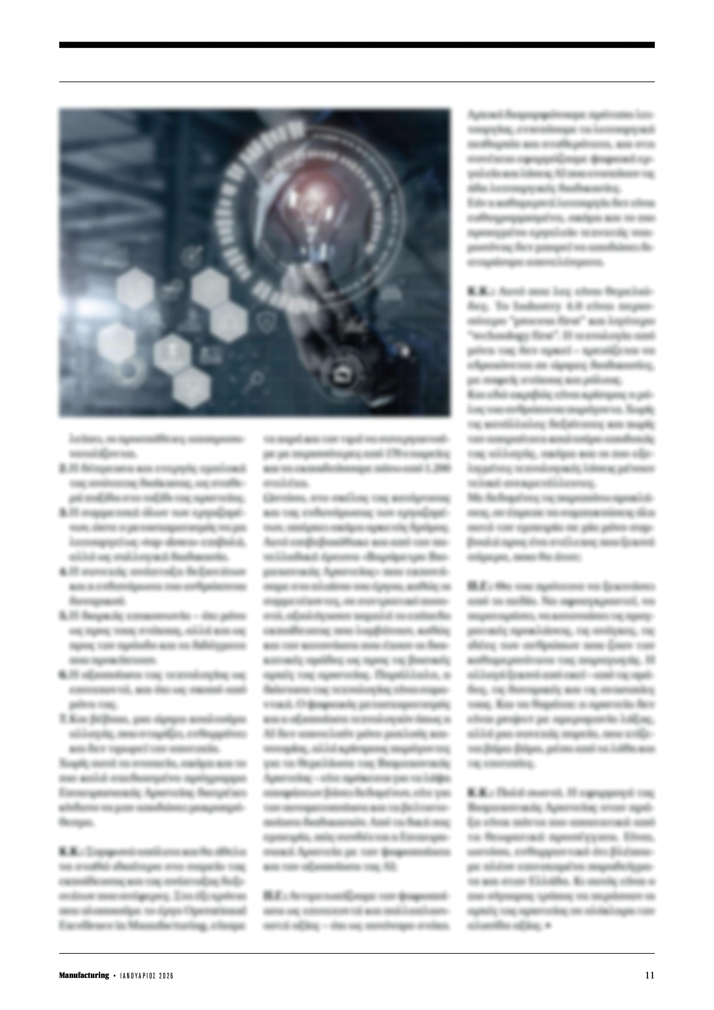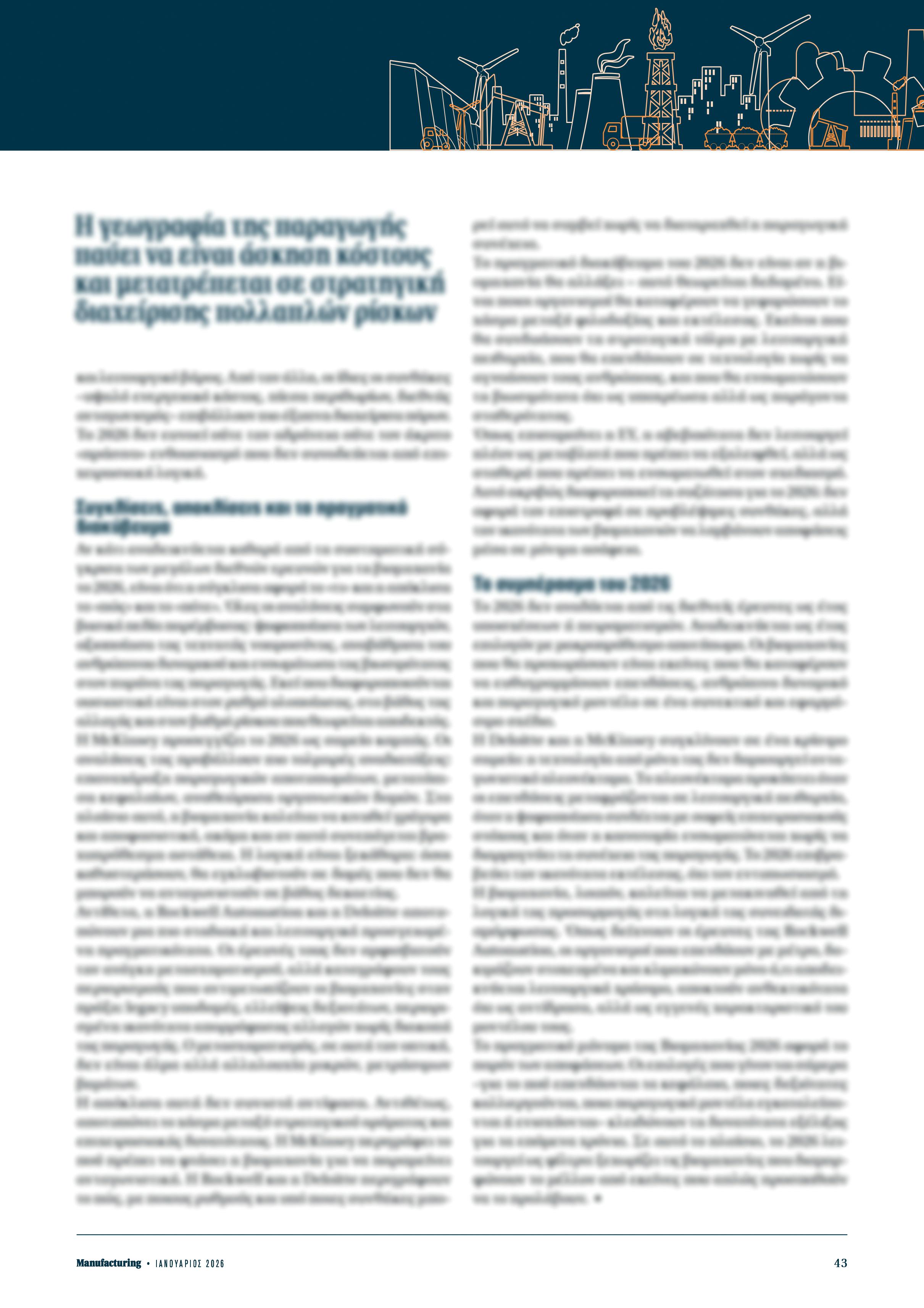 Η Deloitte, στο Manufacturing Industry Outlook 2026, δεν περιγράφει απλώς μια αλλαγή προτεραιοτήτων, αλλά μια ποιοτική μετατόπιση στον τρόπο με τον οποίο αξιολογούνται οι επενδύσεις. Σύμφωνα με τα