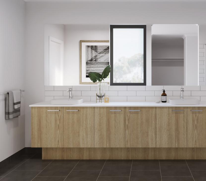 Double vanity with 20mm Crystalline silica-free benchtop to main ensuite (design specific) + Single vanity with 20mm Crystalline silica-free benchtop to main bathroom and powder room (design specific)