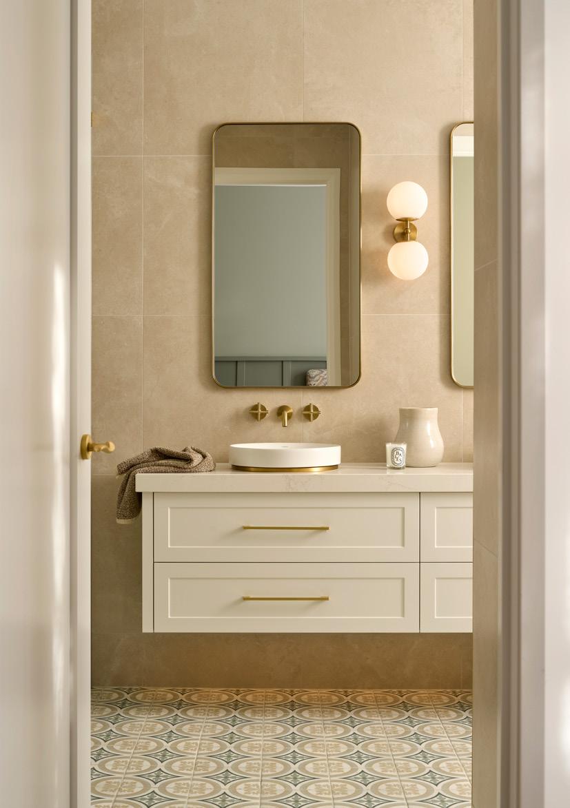 • Polished edge mirrors above all vanity benchtops to match height of shower screen