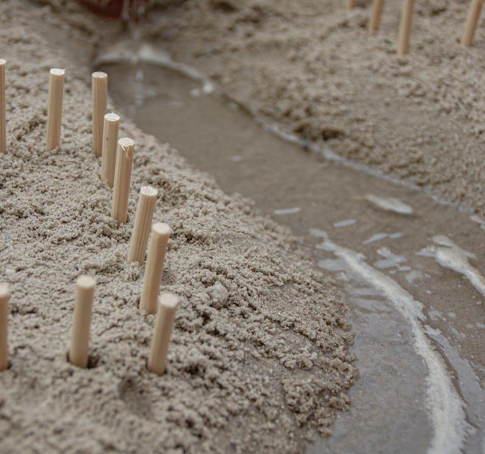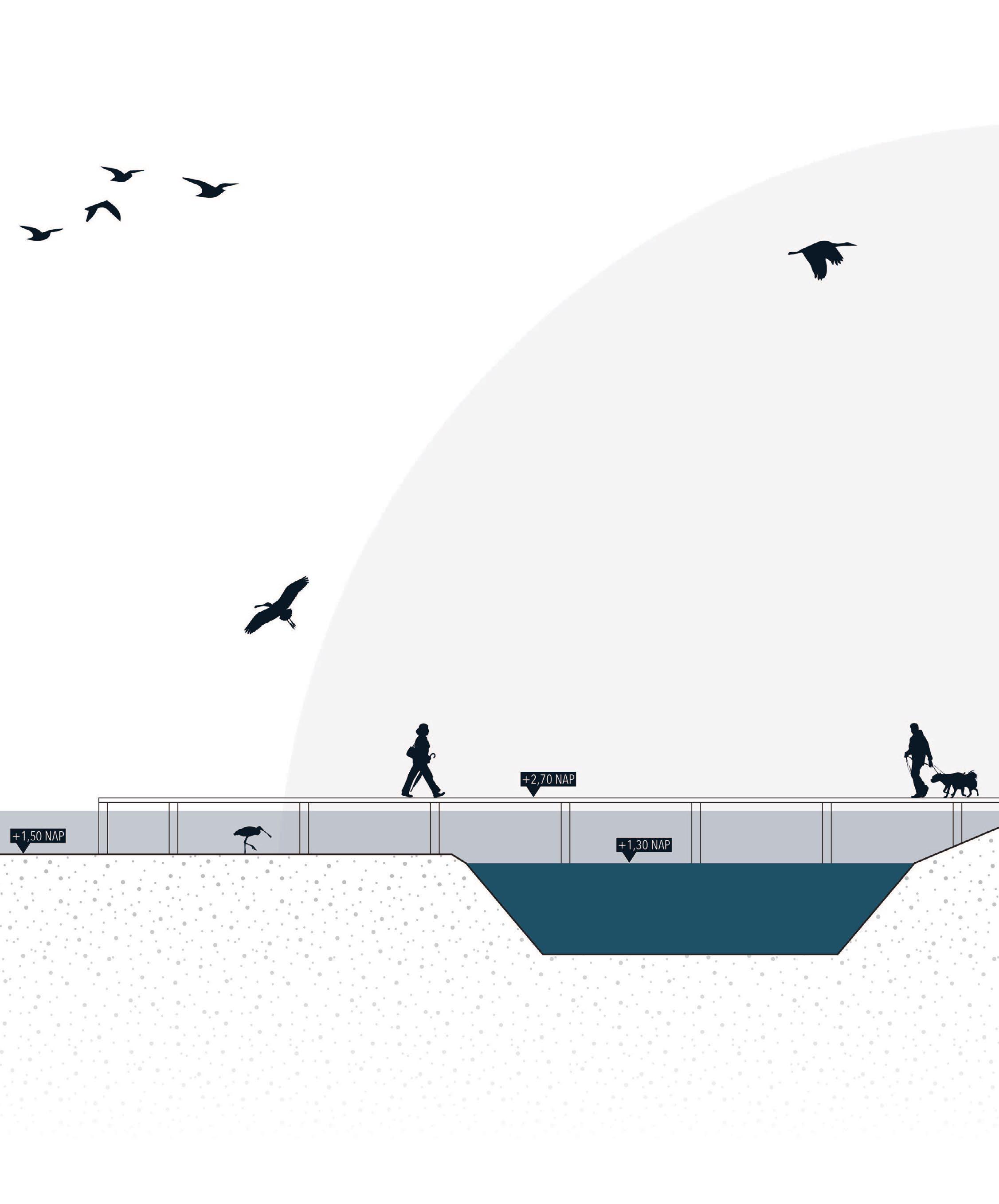 Langs de ringdijk zijn plekken te vinden om de getijden te beleven. Zo kan er via de trap een bank worden bereikt, maar enkel bij eb. Bij vloed staat de bank grotendeels onder water. Dit deel is gemaakt van schanskorven gevuld met oesterschelpen, hier kunnen nieuwe oesters en mosselen tegenaan groeien. Zo wordt een nieuwe oesterbank gevormd die het leven van zowel onder als boven water dichter bij de bezoeker brengt.