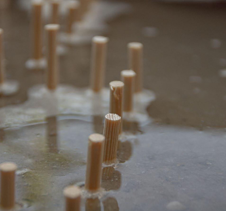 Binnenkant bekleed met hout Zichtpunt met beton onder vloedlijn, hout boven vloedlijn