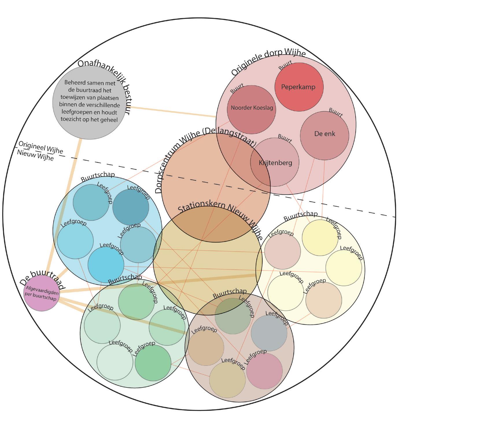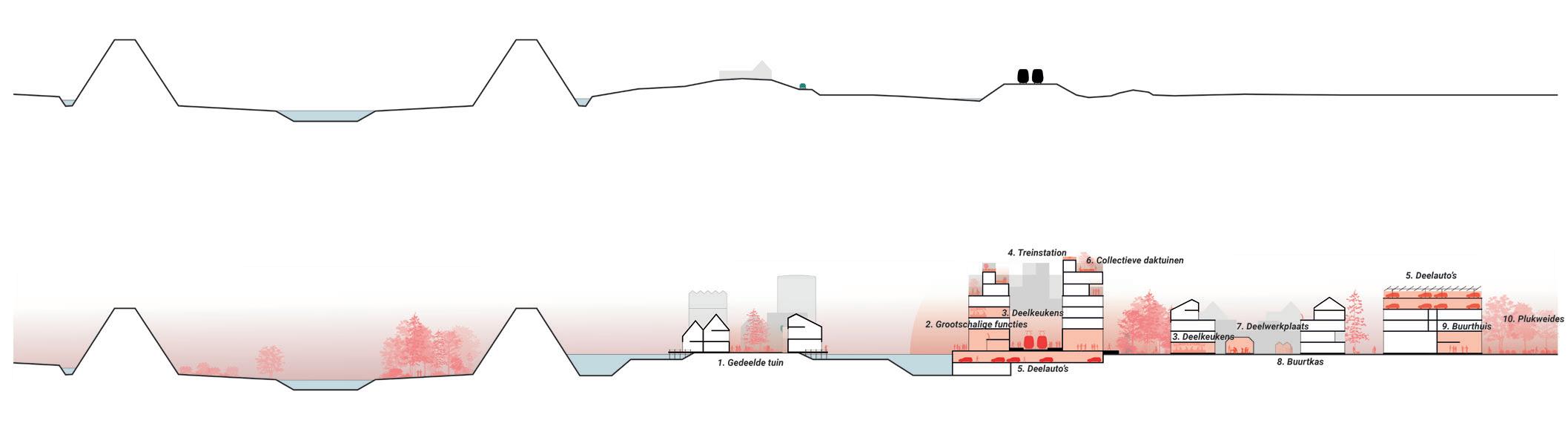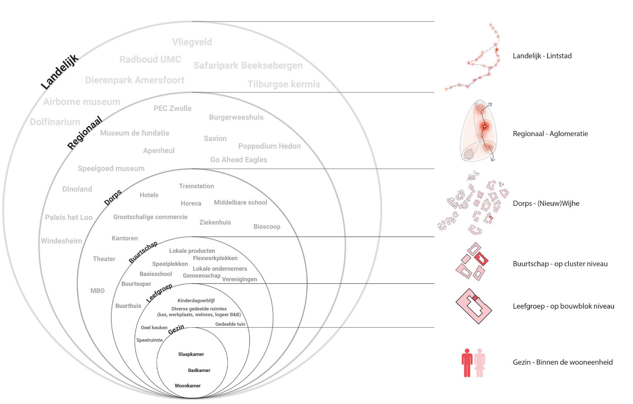 In het plan zit een goed geschaalde getrapte collectiviteit. Aan elk niveau van samen zijn worden verschillende soorten niveaus van gedeeldheid en voorzieningen gekoppeld. Dit maakt ook goed inzichtelijk wat de verhoudingen en samenhang zijn van individueel huishouden, tot leefgroep, tot buurt, tot dorp en uiteindelijk tot de regio en de totale Lintstad en Nederland.