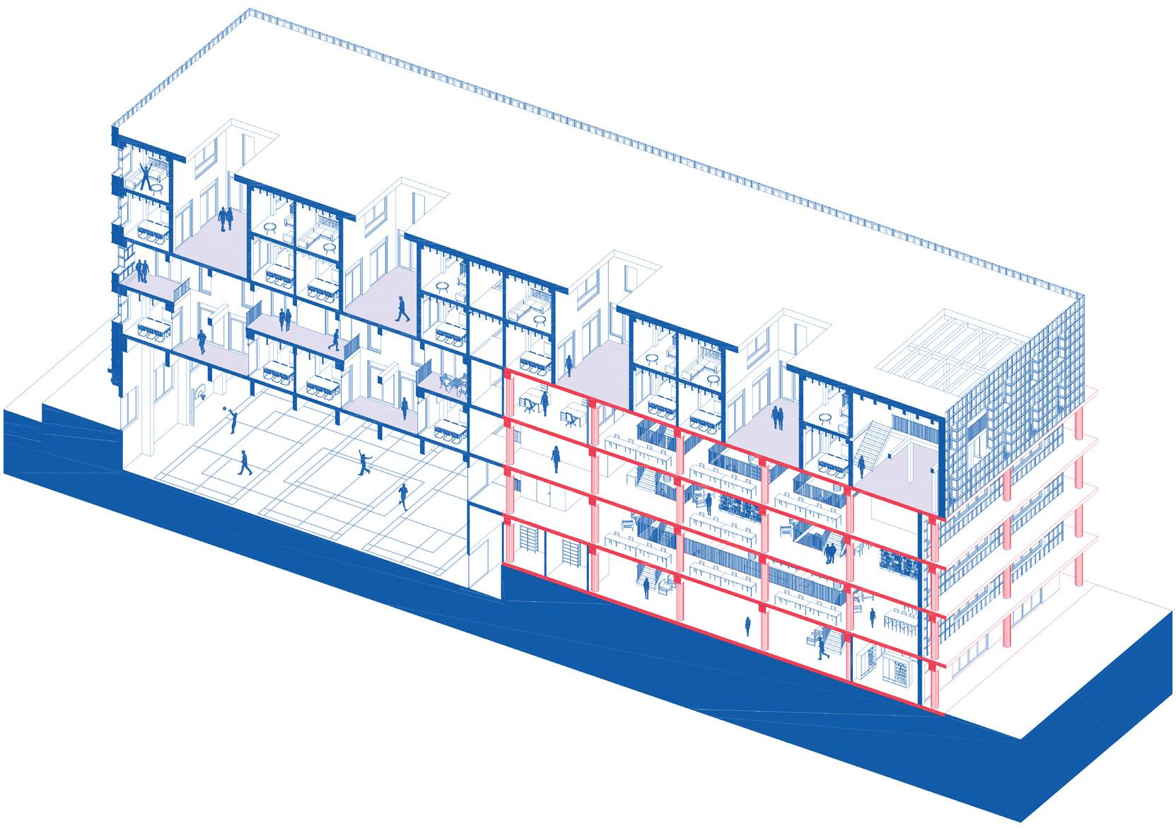 De jongeren starten en sluiten hun dag af in hun eigen kamer met het uitzicht over de stad. Hun toekomst. De plek voor de jongere zelf waar hij of zij zich bij behoefte kan terugtrekken.