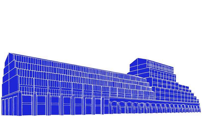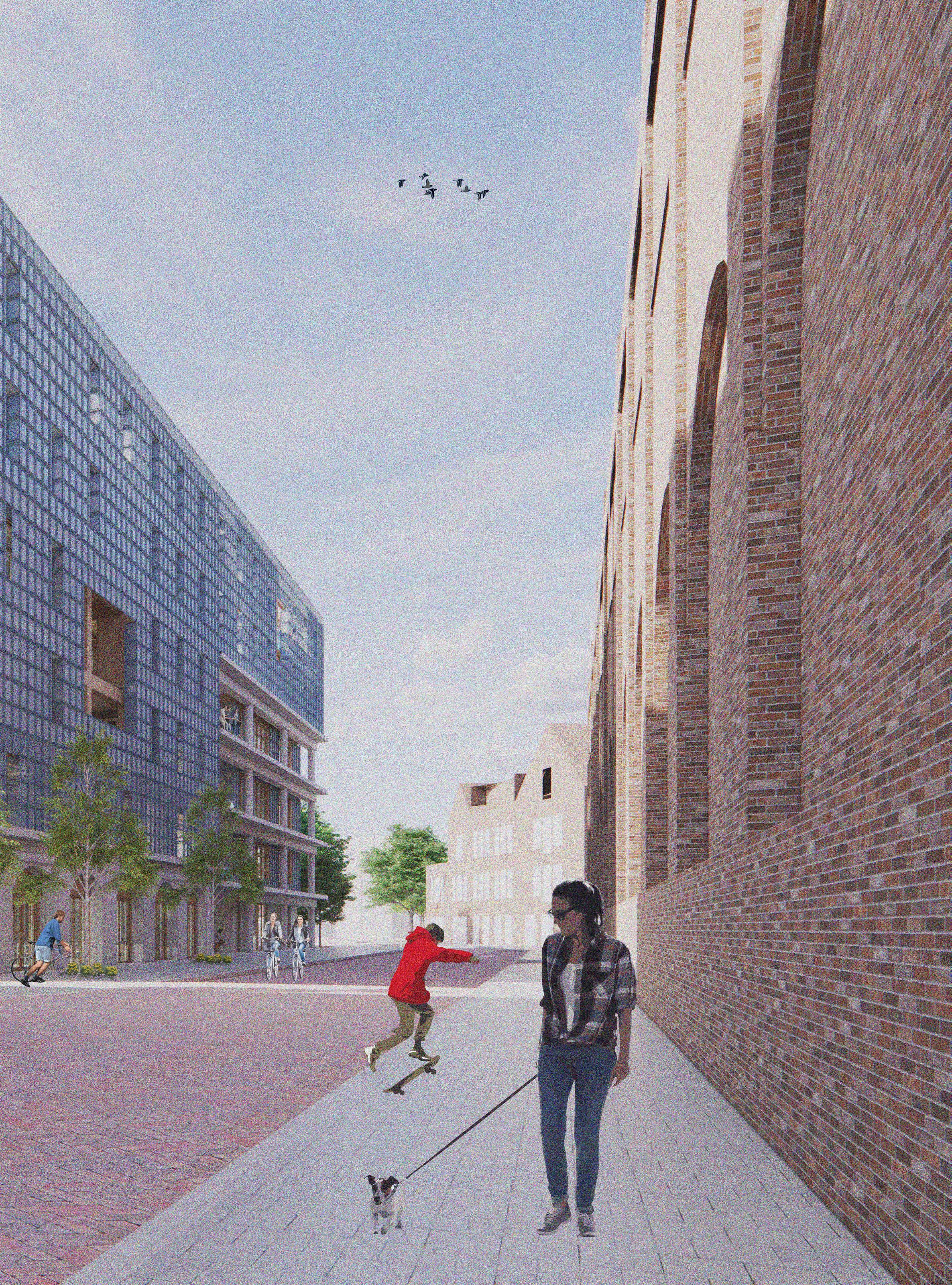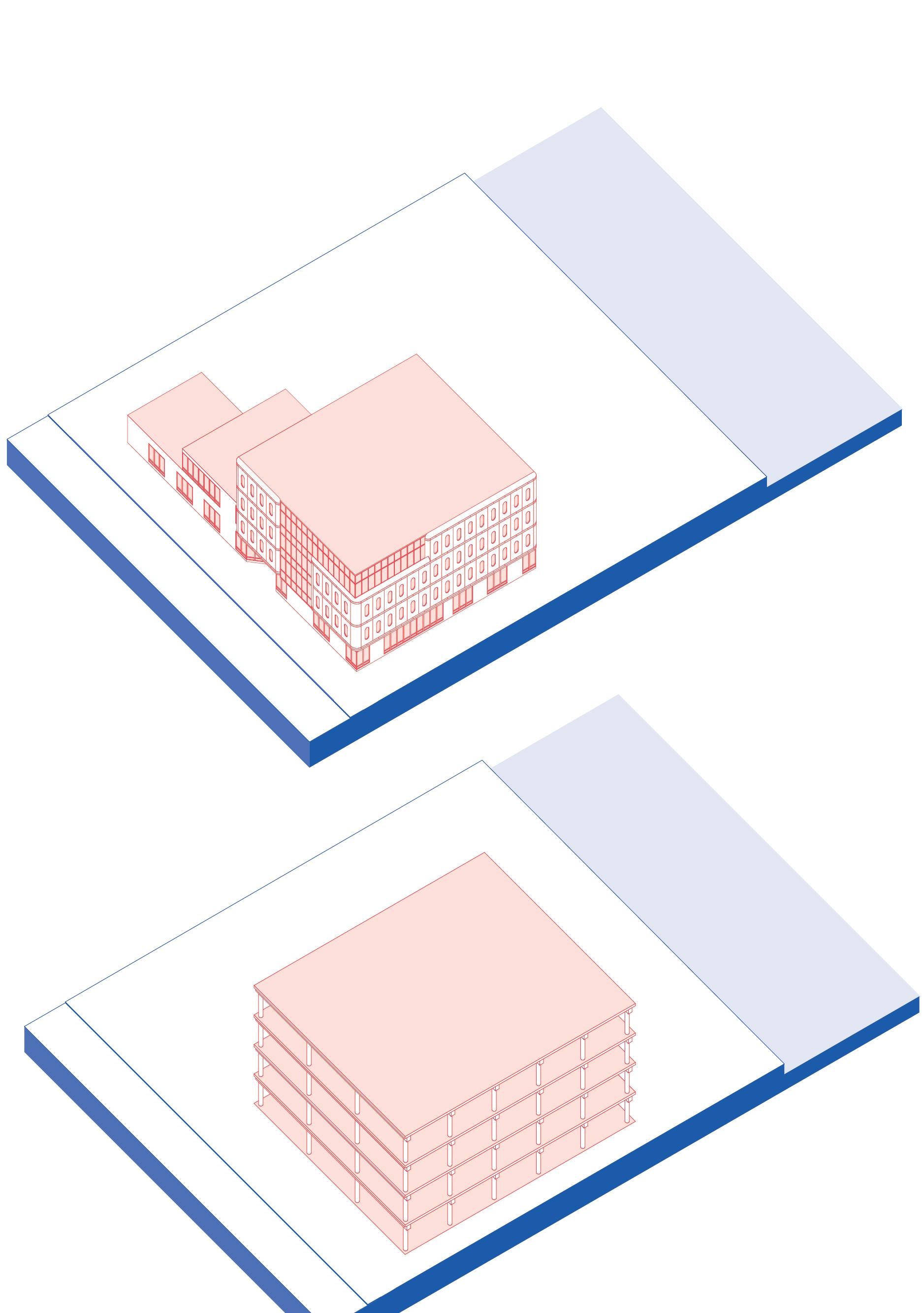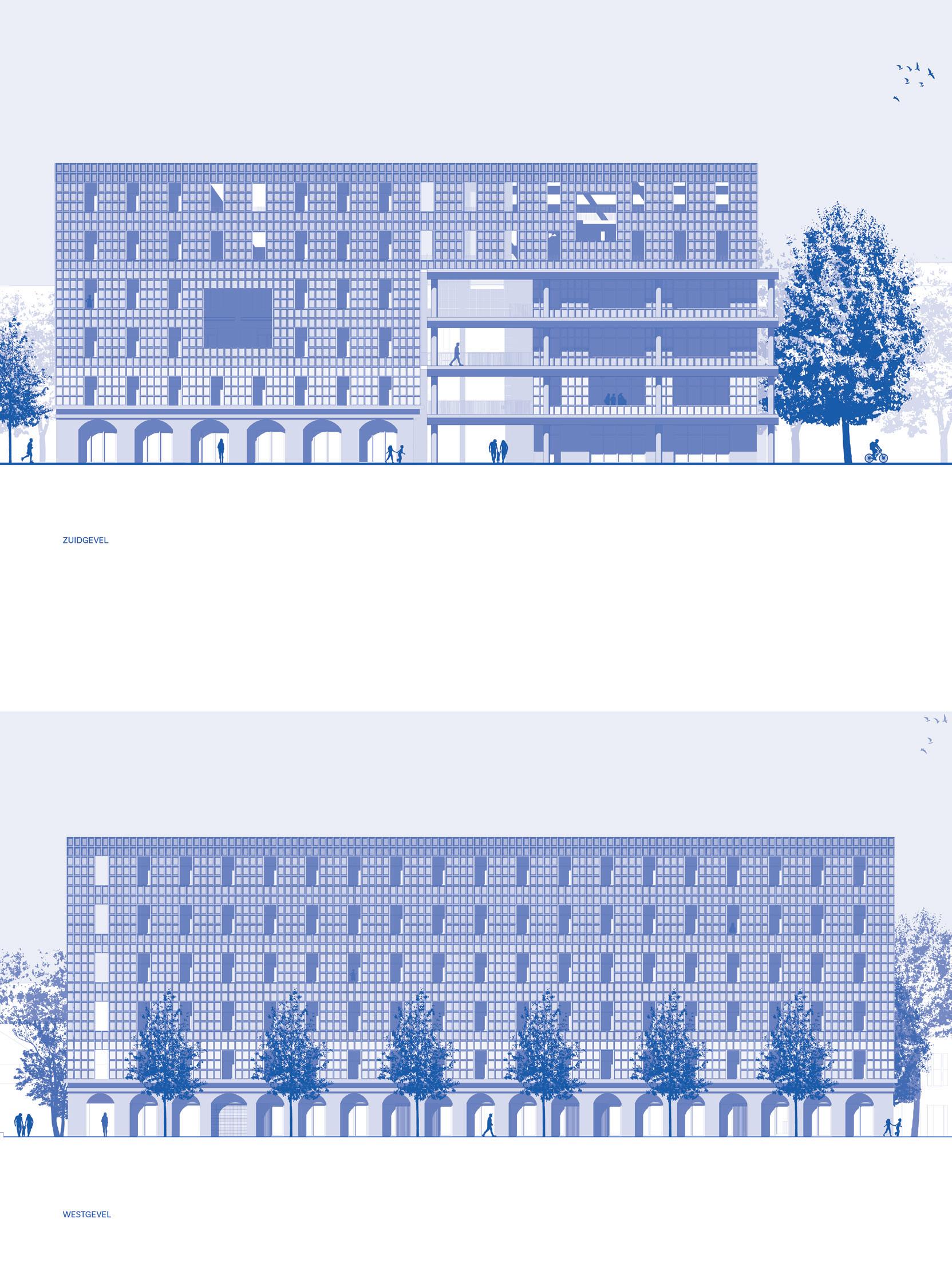 Grootschalig karakter van gebouwtypologie om in te bedden binnen zijn stedenbouwkundige context.