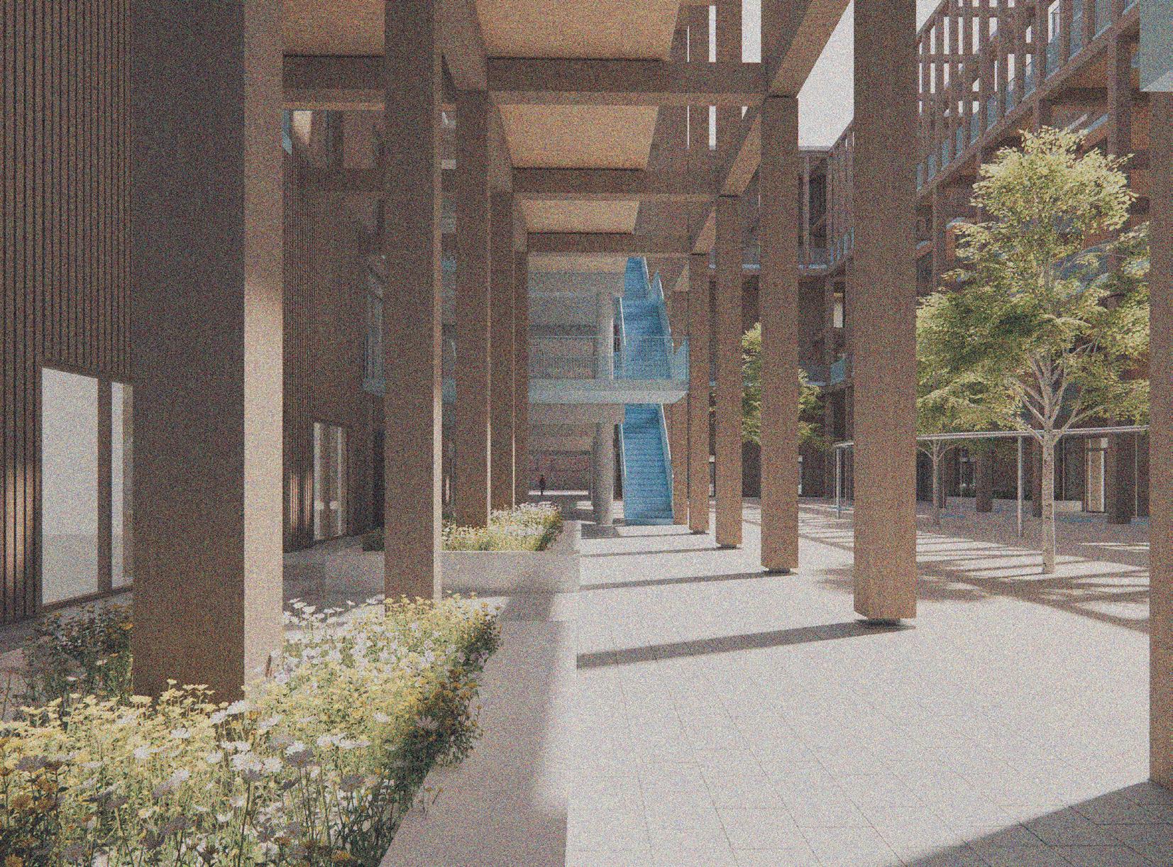 Rondom het hof ligt de buitengang welke door een kolommenraster van elkaar wordt gescheiden. De buitengangen met extra breedte en een dubbele hoogte geeft mogelijkheden voor divers gebruik en intensievere sociale interactie.