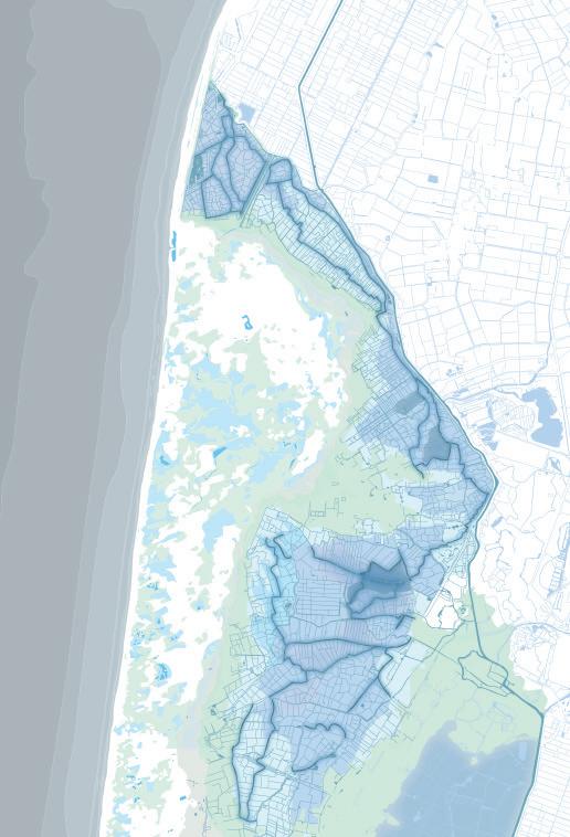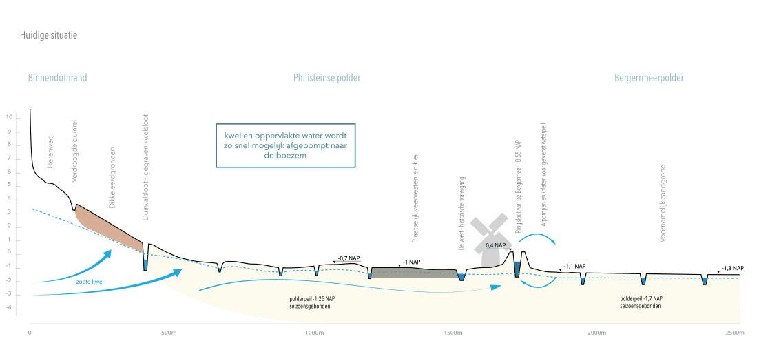 De watergangen, die historisch parallel lopen aan de duinen, vormen de groen/ blauwe aders in de binnenduinrand en de polder. Hier kan het water vrij naartoe stromen en komt de zoete kwel omhoog. Deze watergangen worden verbreed om meer water te kunnen bufferen.