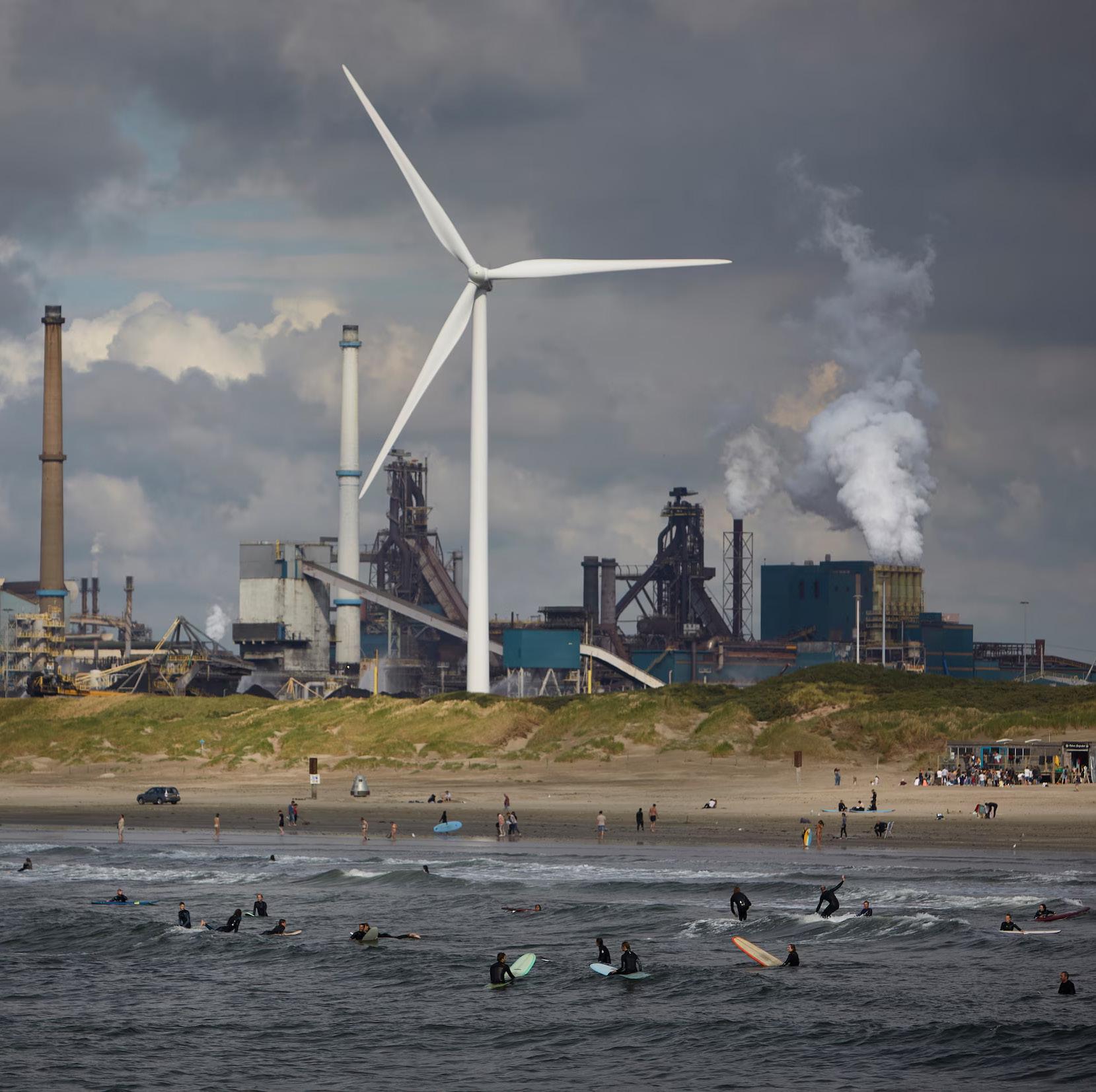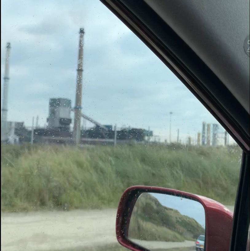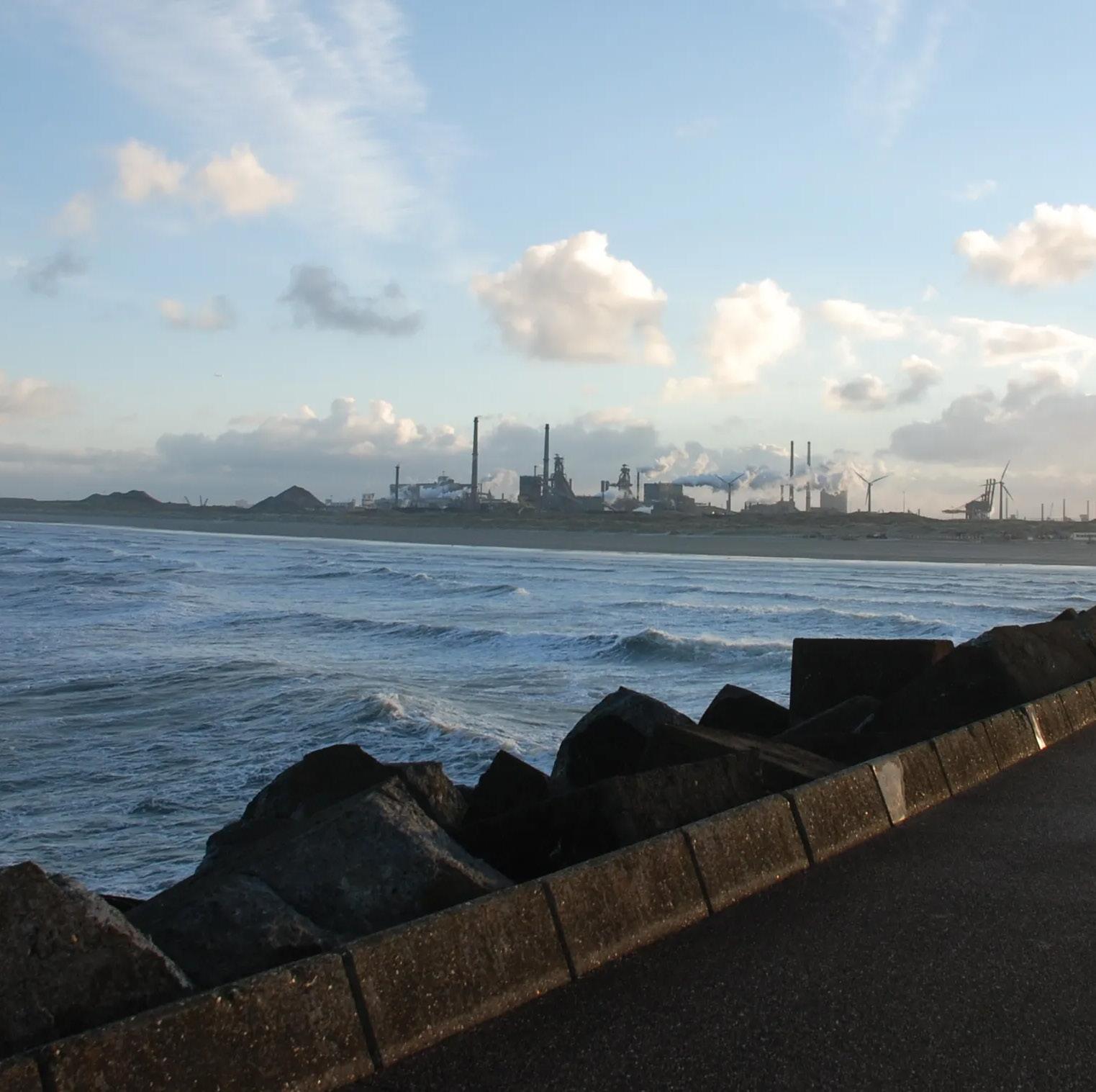 Tata Steel vormt een massieve achtergrond die voortdurend contrasteert met de openheid van het kustlandschap. De silhouetten van schoorstenen en installaties bepalen de horizon en leggen de spanning bloot tussen natuur en industrie.