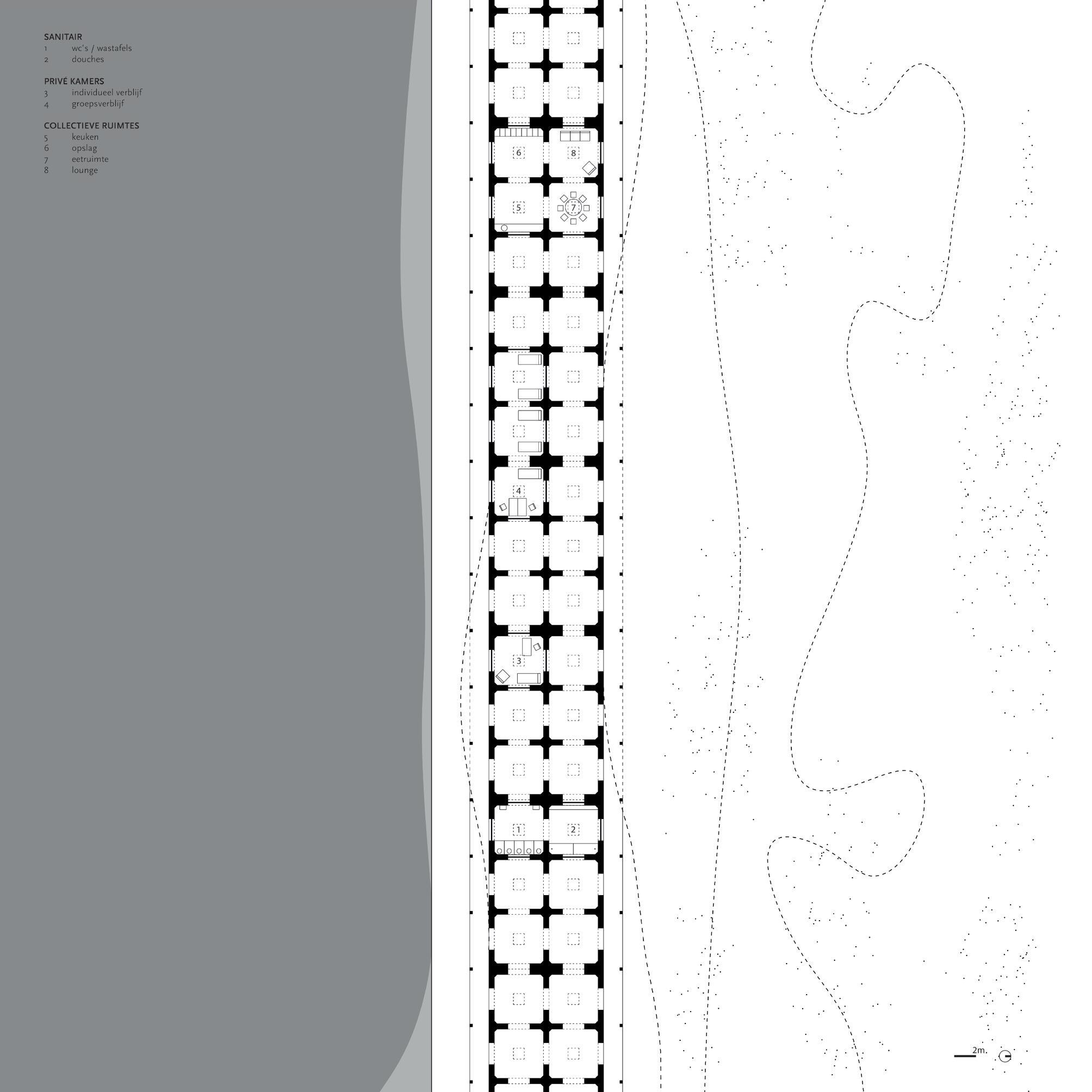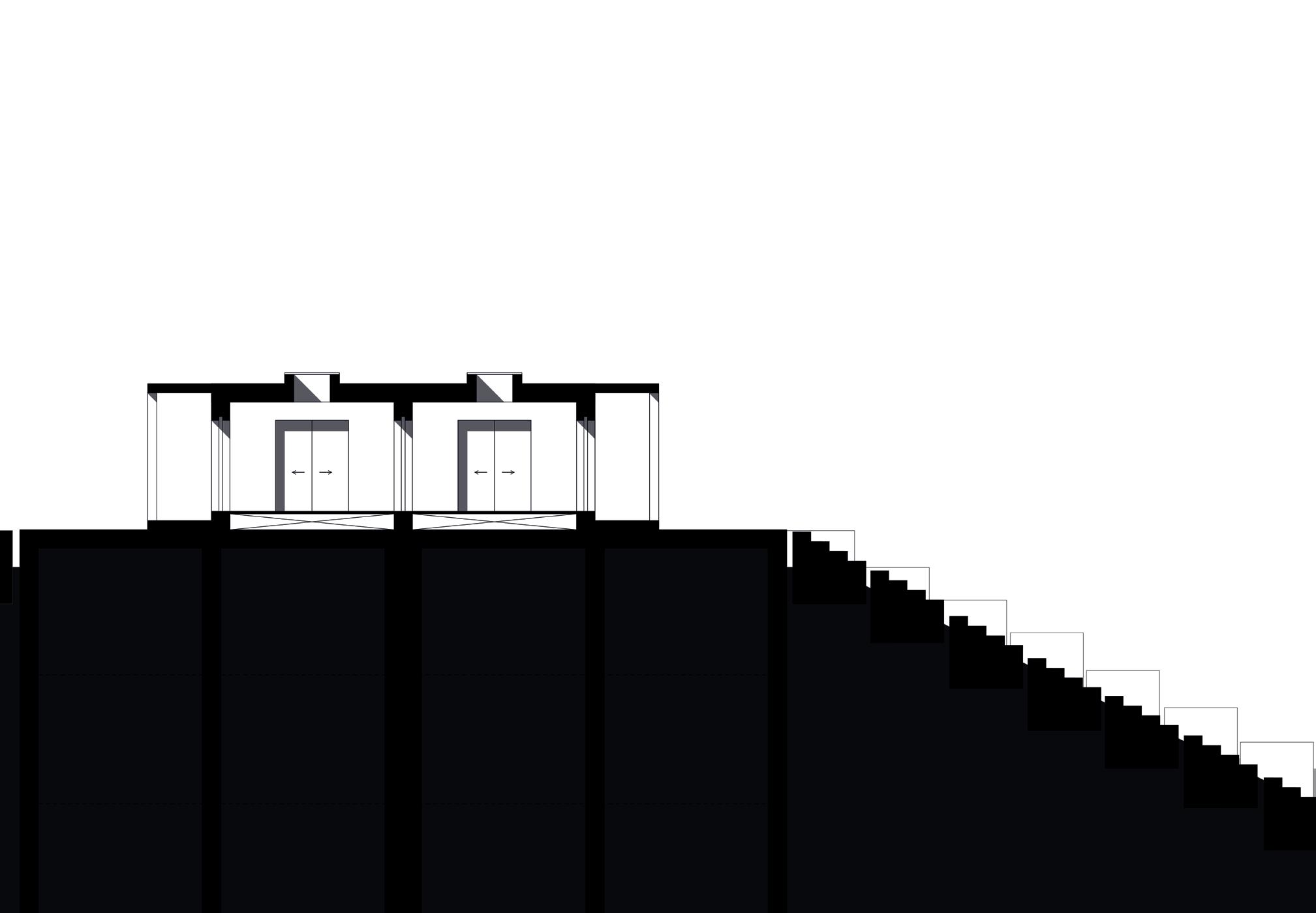 De bovenste manchetten zijn voorzien van sparingen en schuifdeuren voor toegankelijkheid, privacy en compartimentering. Daglicht valt binnen via openingen in de afdekplaat.