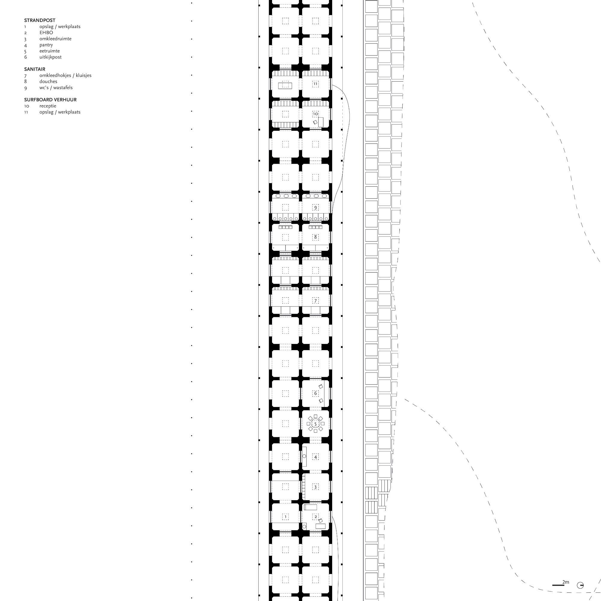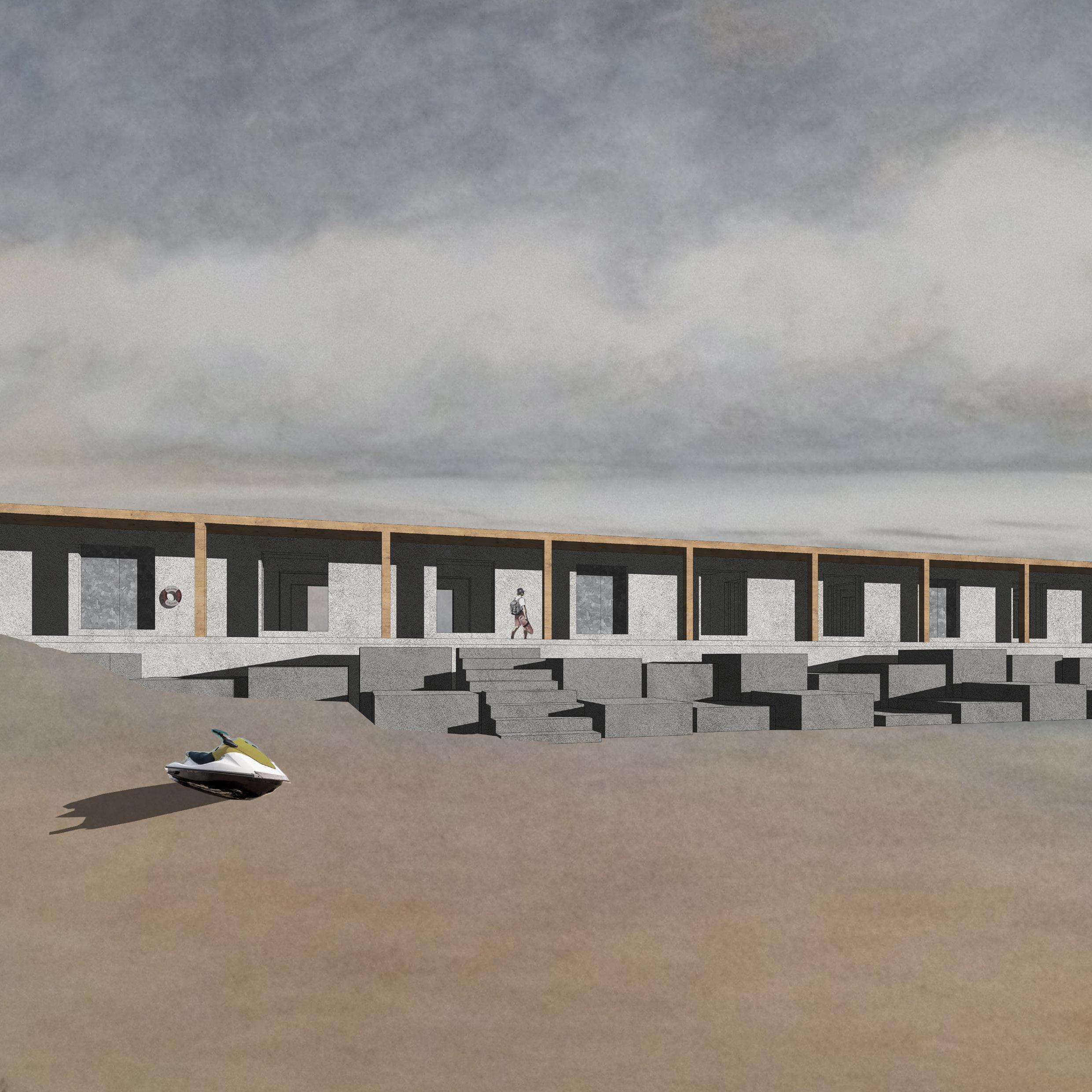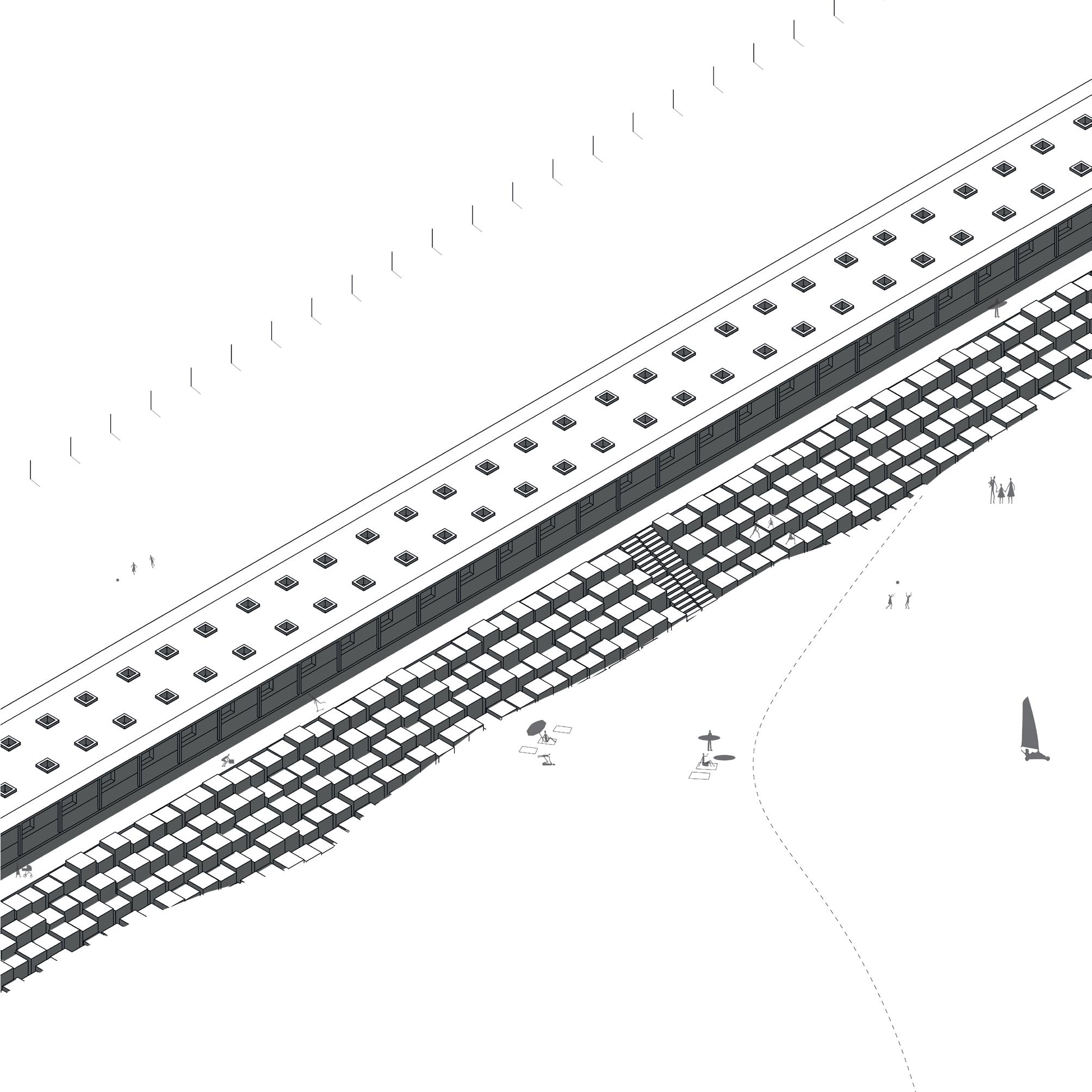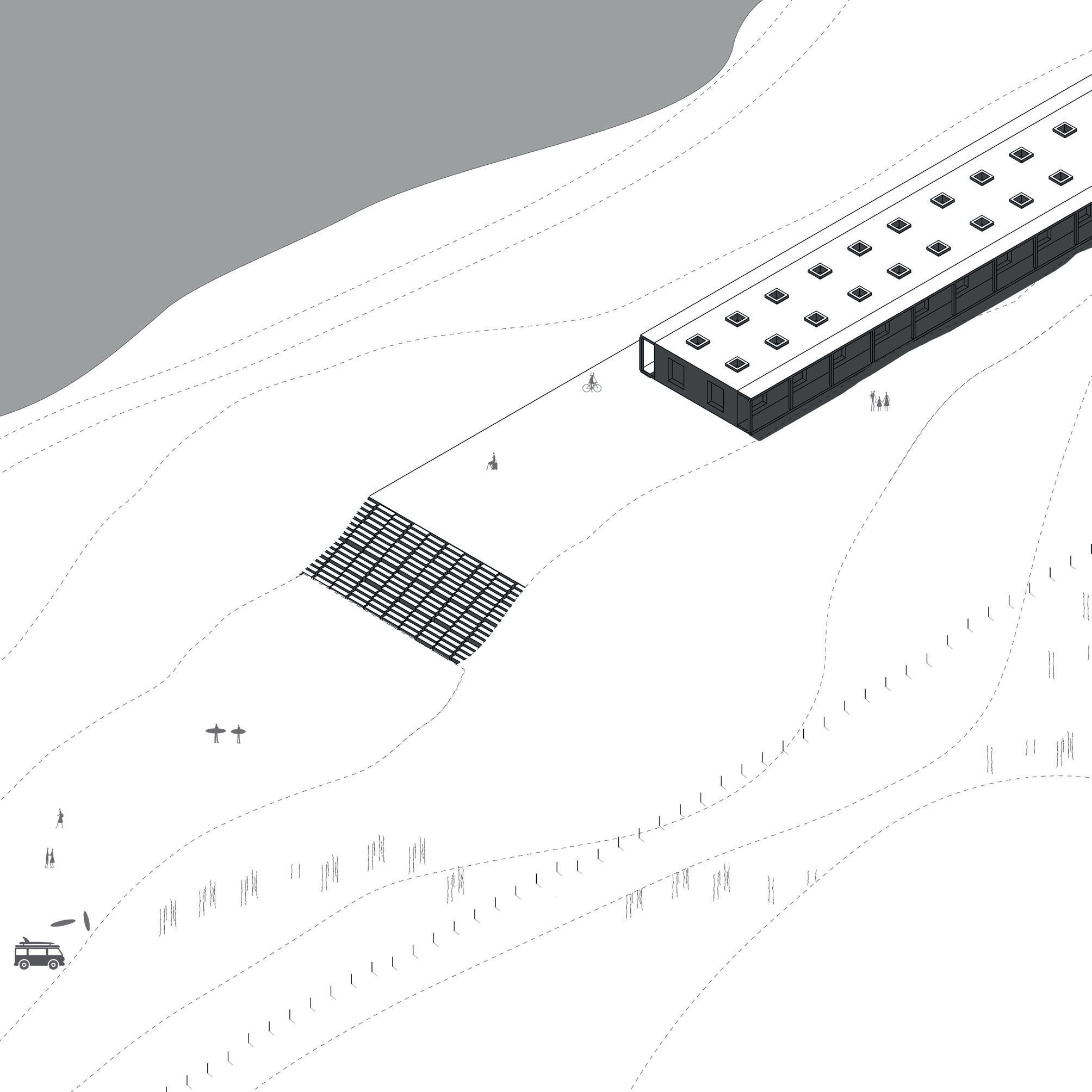 De extra laag manchetten in de toekomstige ophoging wordt benut voor een surfaccommodatie met slaaphutten, sanitaire voorzieningen, kleedruimtes, surfschool en paviljoen. Trappen en luifels verbinden het geheel met strand, zee en duinen. Bij dijkverhoging worden openingen dichtgestort en kamers gevuld met zand, waardoor de structuur weer puur civiel wordt.