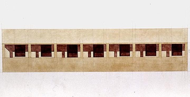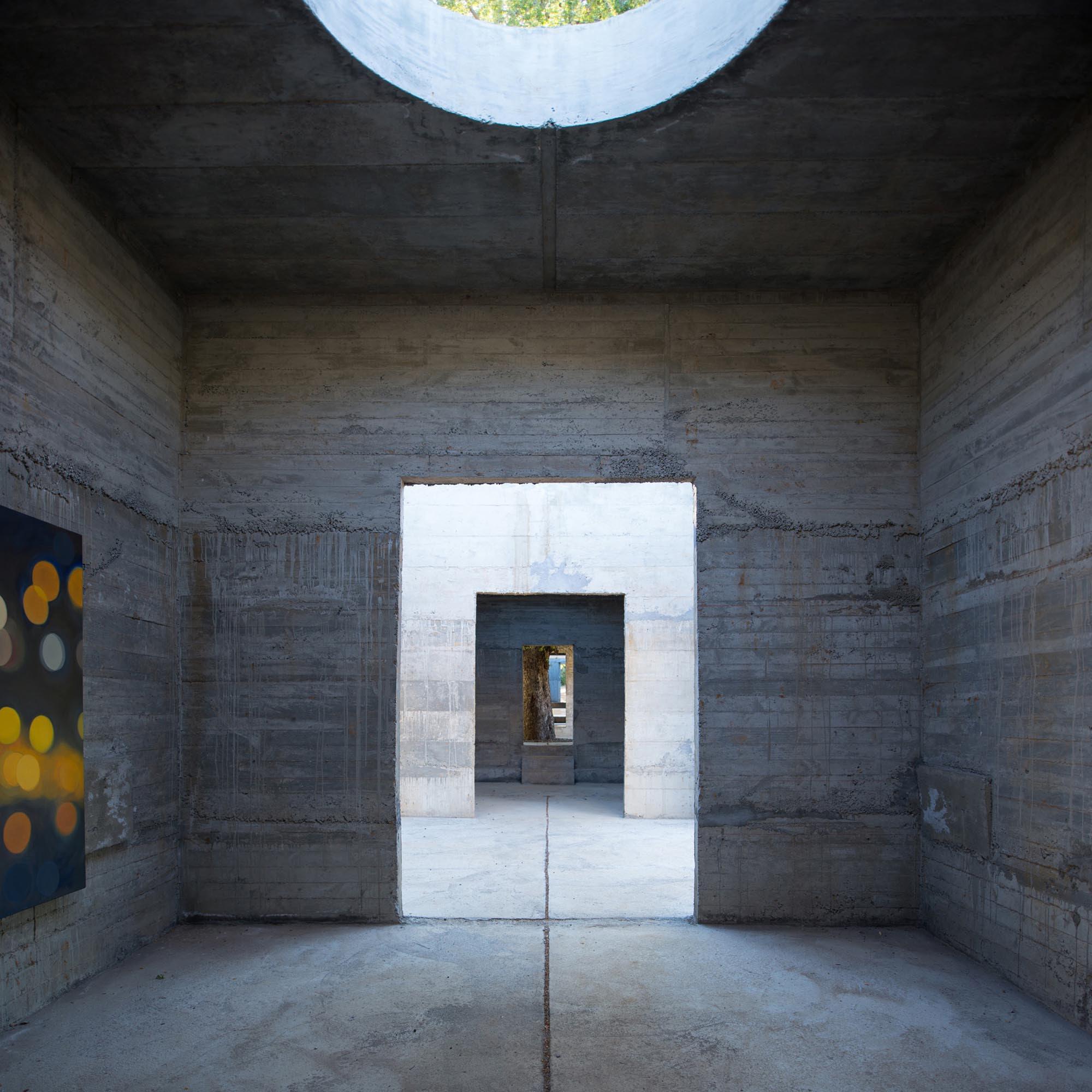 Elke rechthoekige opening kadert het landschap op een andere manier. De doorgangen maken intieme kijkpunten die de bezoeker steeds verrassen.