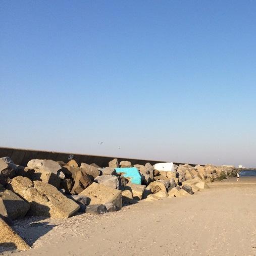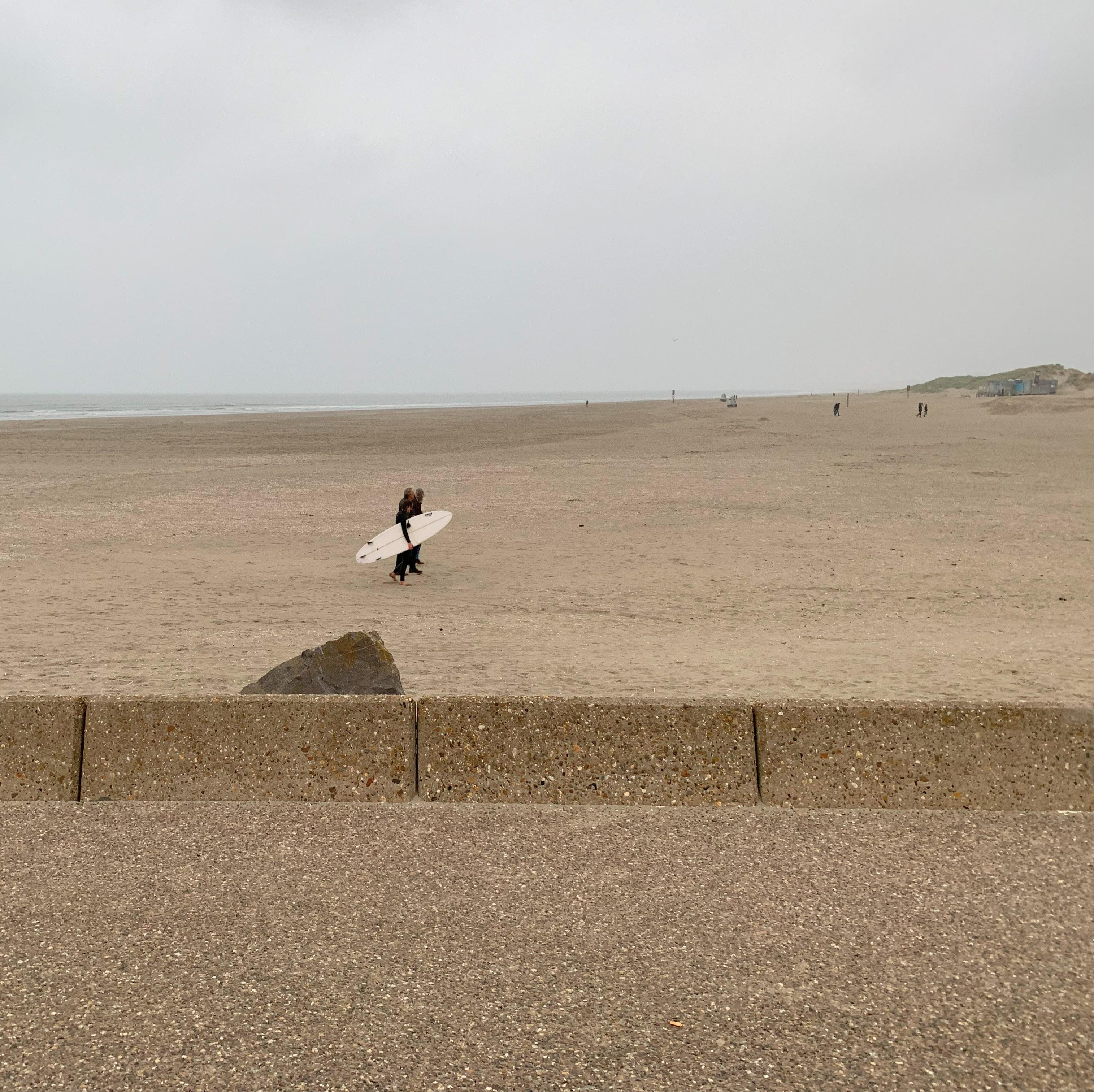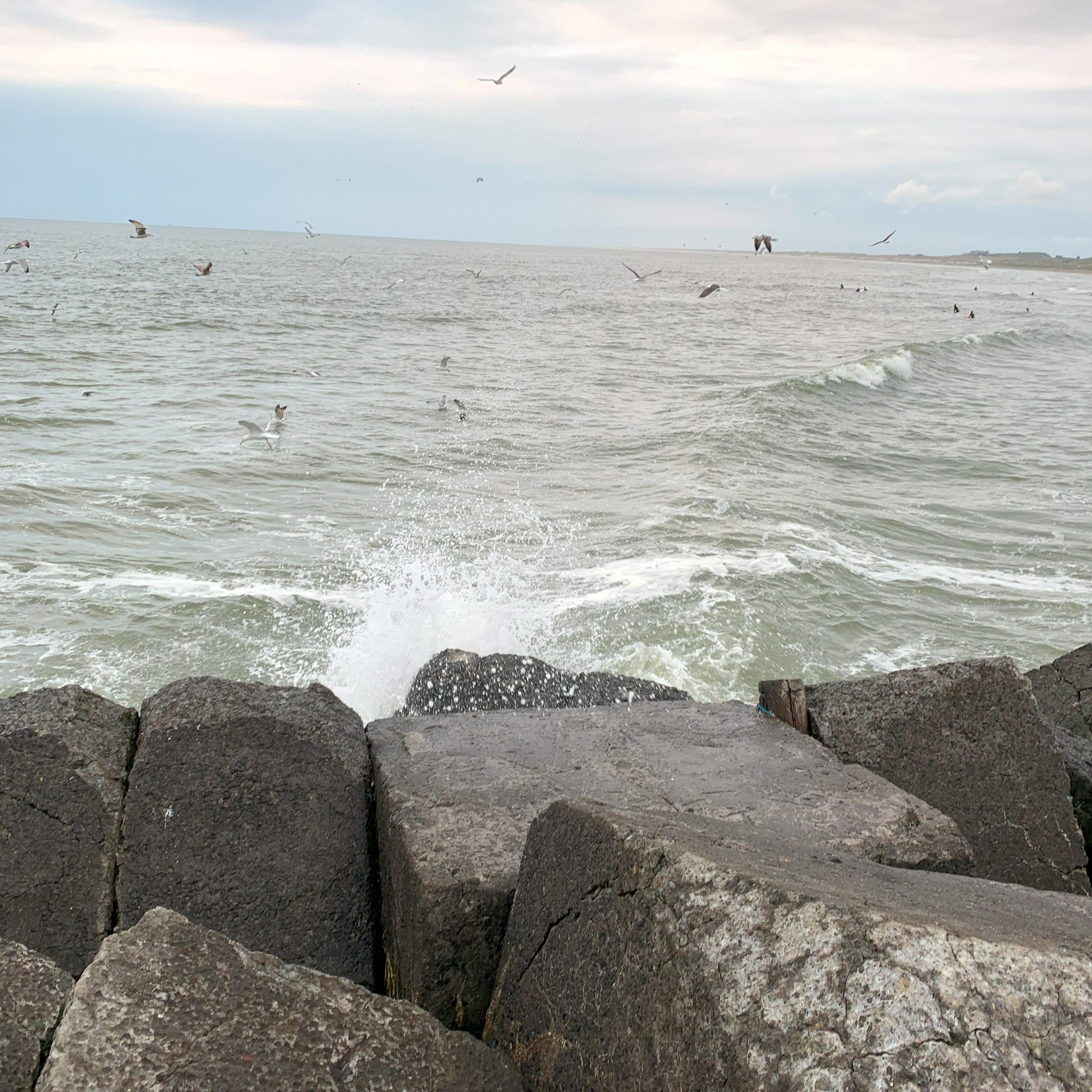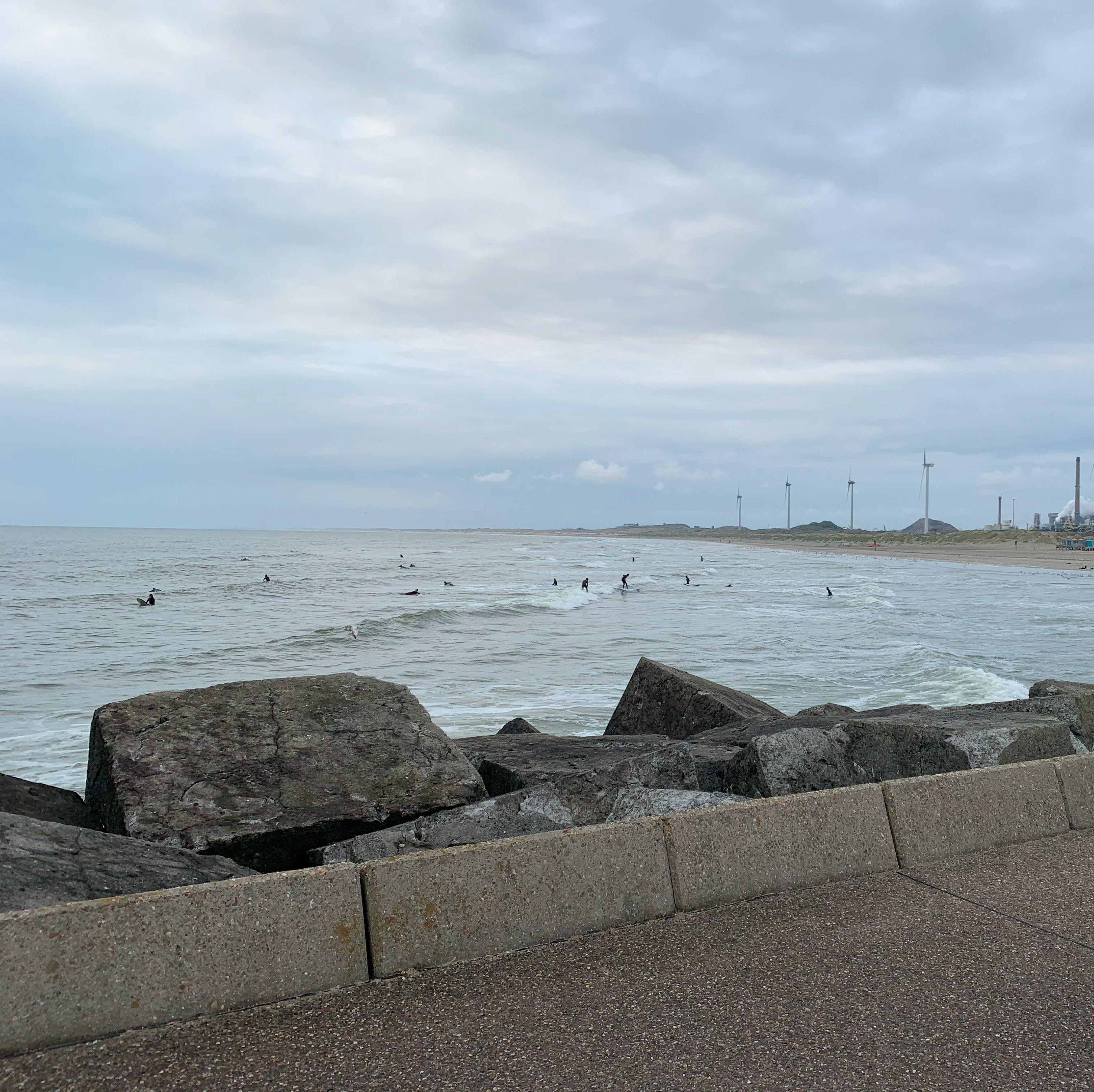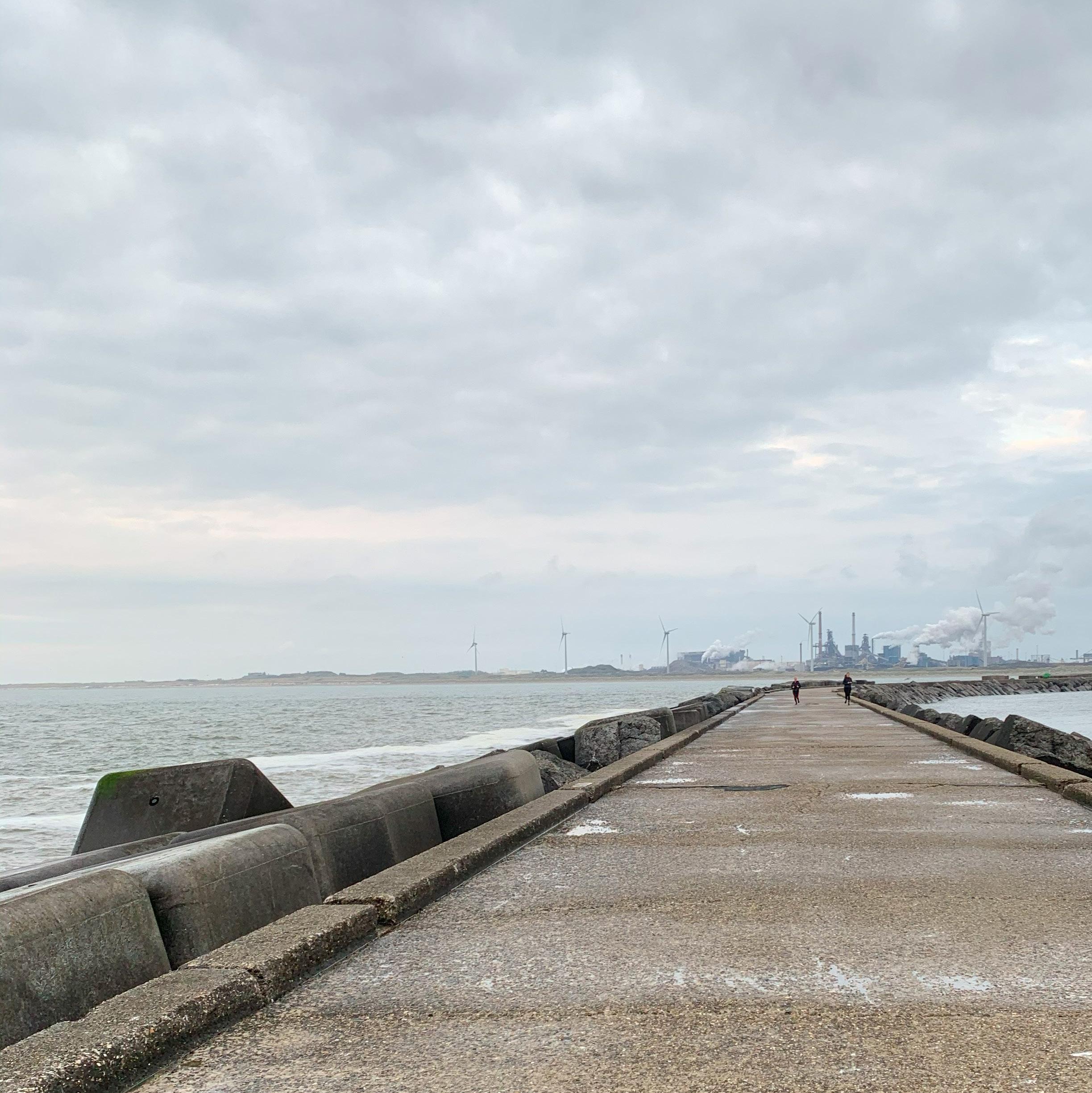 Aan het einde van de dijk lopen de betonblokken af in de zee. Hier, ver van de kust, ervaart de bezoeker wind en water terwijl de horizon zich opent met duinen en Tata Steel op de achtergrond.
