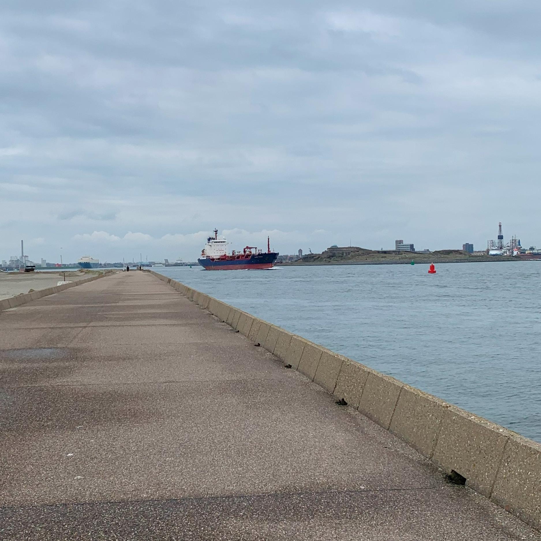 De pier markeert scherp de overgang tussen de bedrijvige havenmond en de aangrenzende duinen. Hier wordt de lijn tussen industriële activiteit en dynamisch kustlandschap zichtbaar.