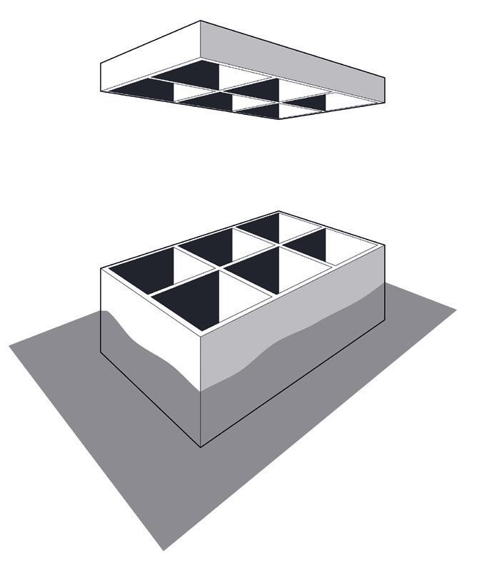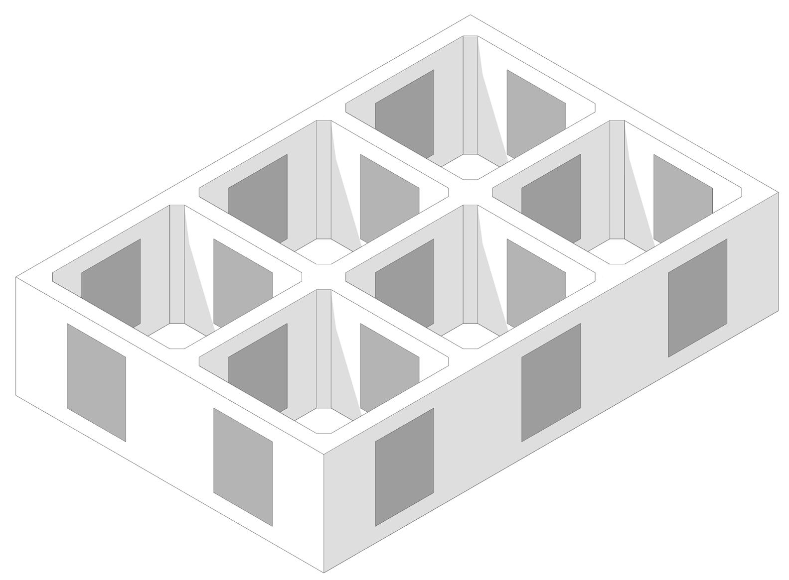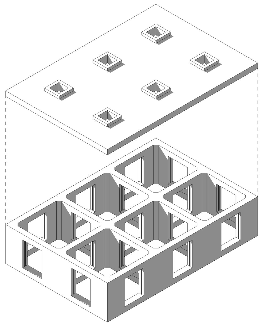 Het ontwerp benut de repetitieve structuur van caissons en manchetten als ruimtelijke drager. Binnen het 5x5-metergrid ontstaan gekoppelde kamers die met sparingen, schuifdeuren en daglichtopeningen flexibel inzetbaar zijn.