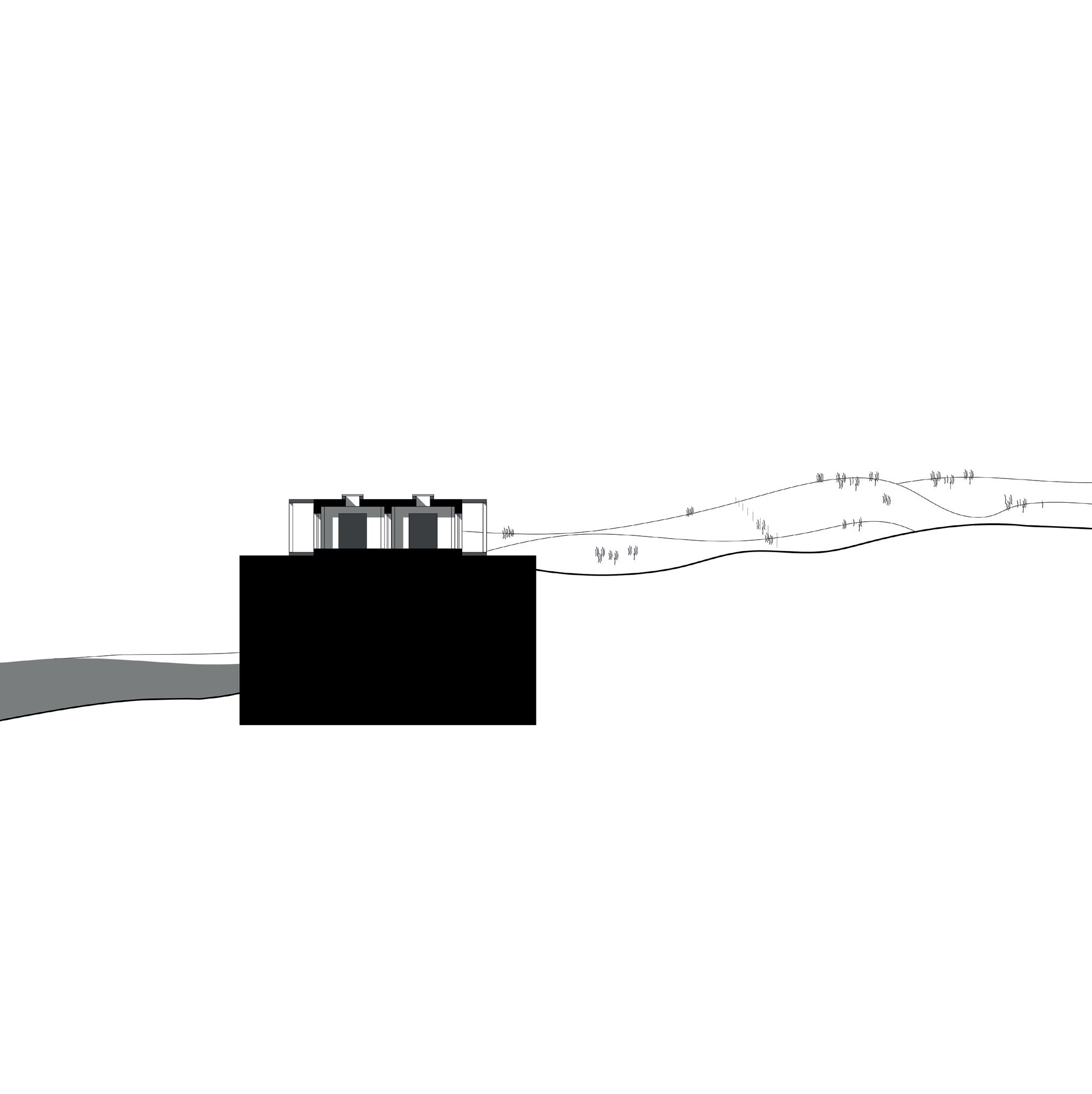 Tussen de loopzones liggen kamers in het herhalende 5x5-metergrid van de caissons. Aansluitende duinpaden verbinden de ruimtes met het landschap.