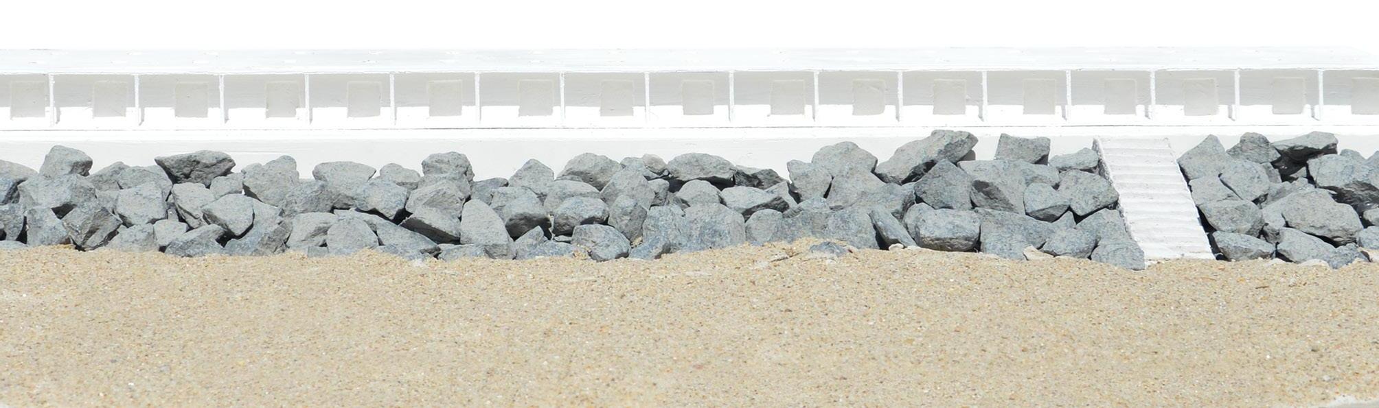 Aan de strandzijde wordt de taludbekleding zichtbaar in onregelmatige betonblokken. Tussen deze blokken leiden trappen en opstappen direct naar het strand.