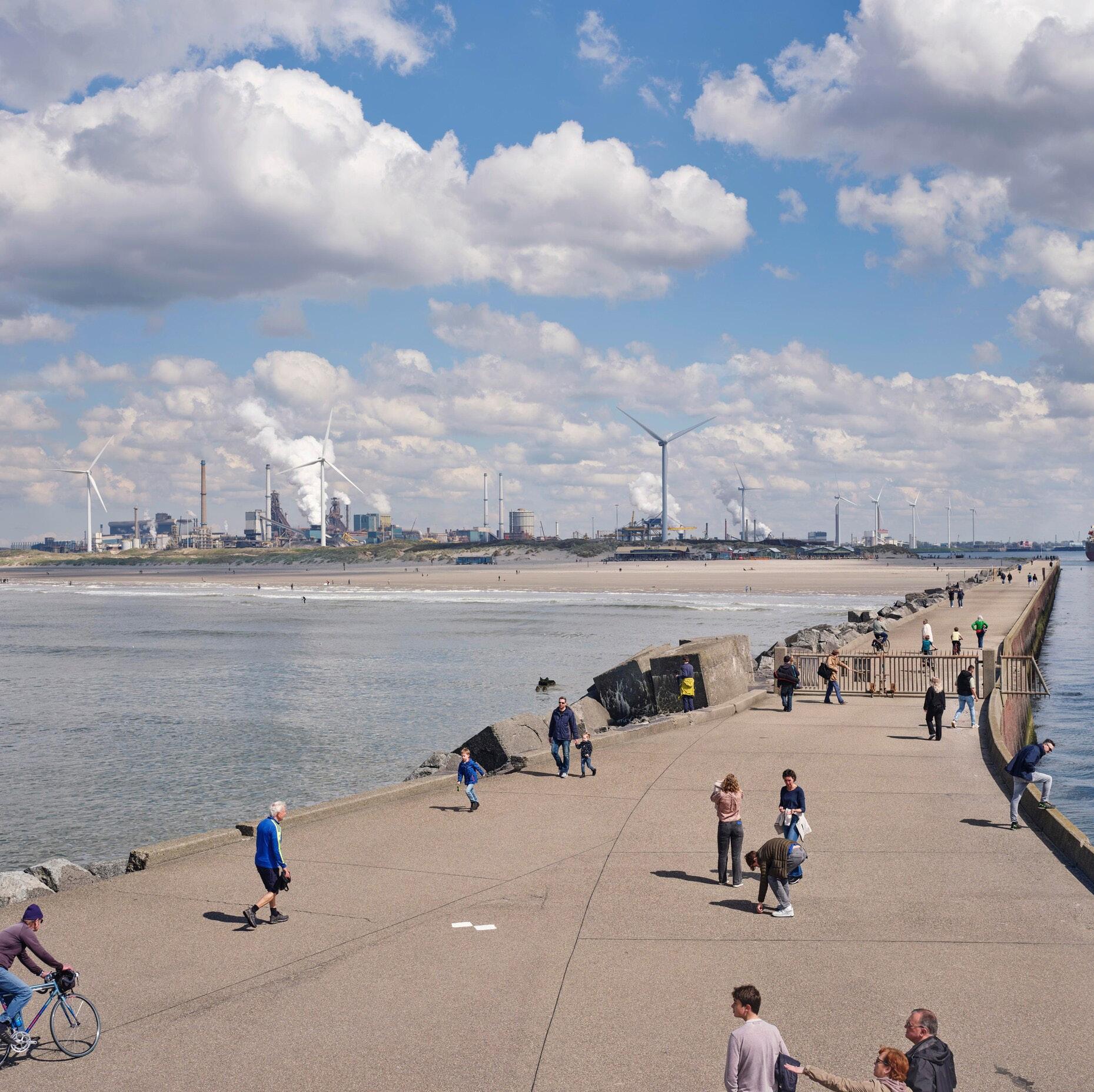 De Noordpier vormt een harde grens tussen de drukke havenmond en het open strand. Op deze plek bestaan industrie en recreatie direct naast elkaar.