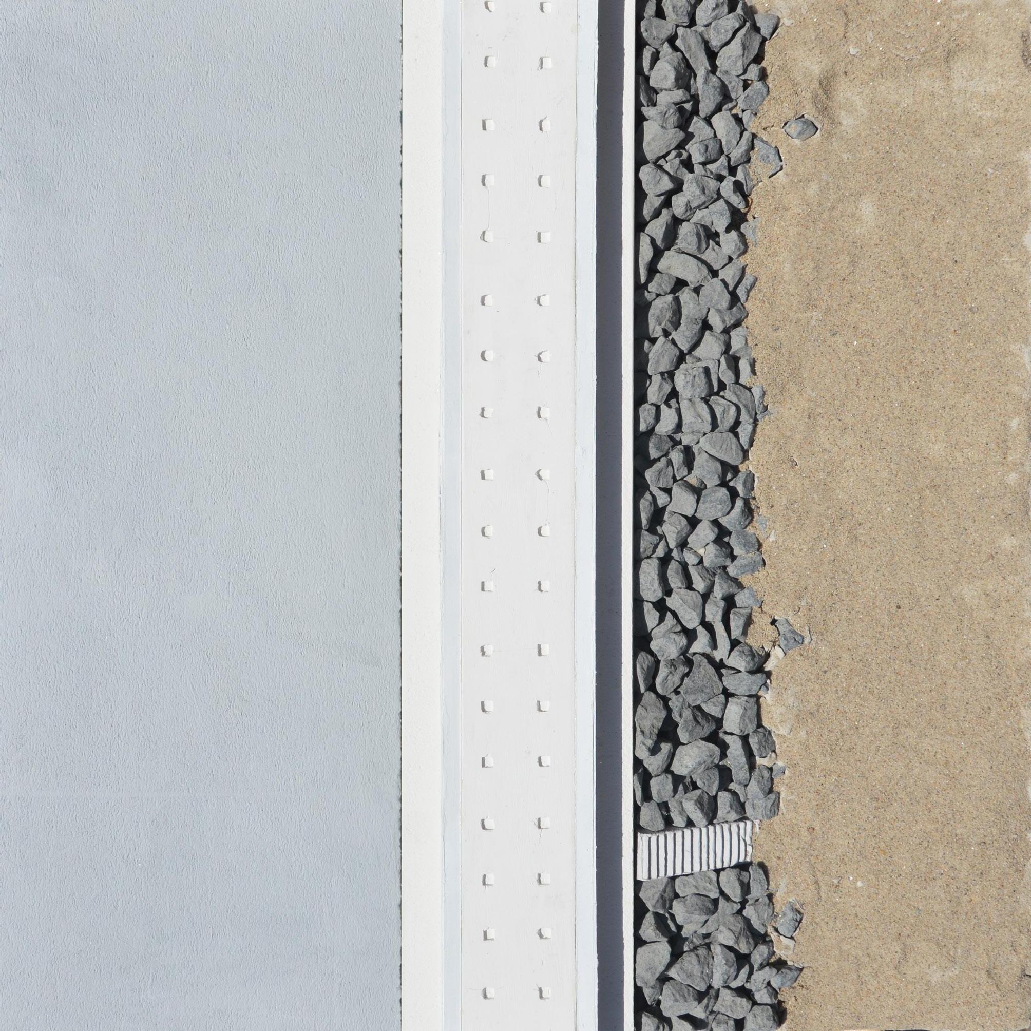 Soms waait het zand over de loopzones en dringt het duinlandschap de architectuur binnen. Grenzen tussen gebouw en natuur vervagen.