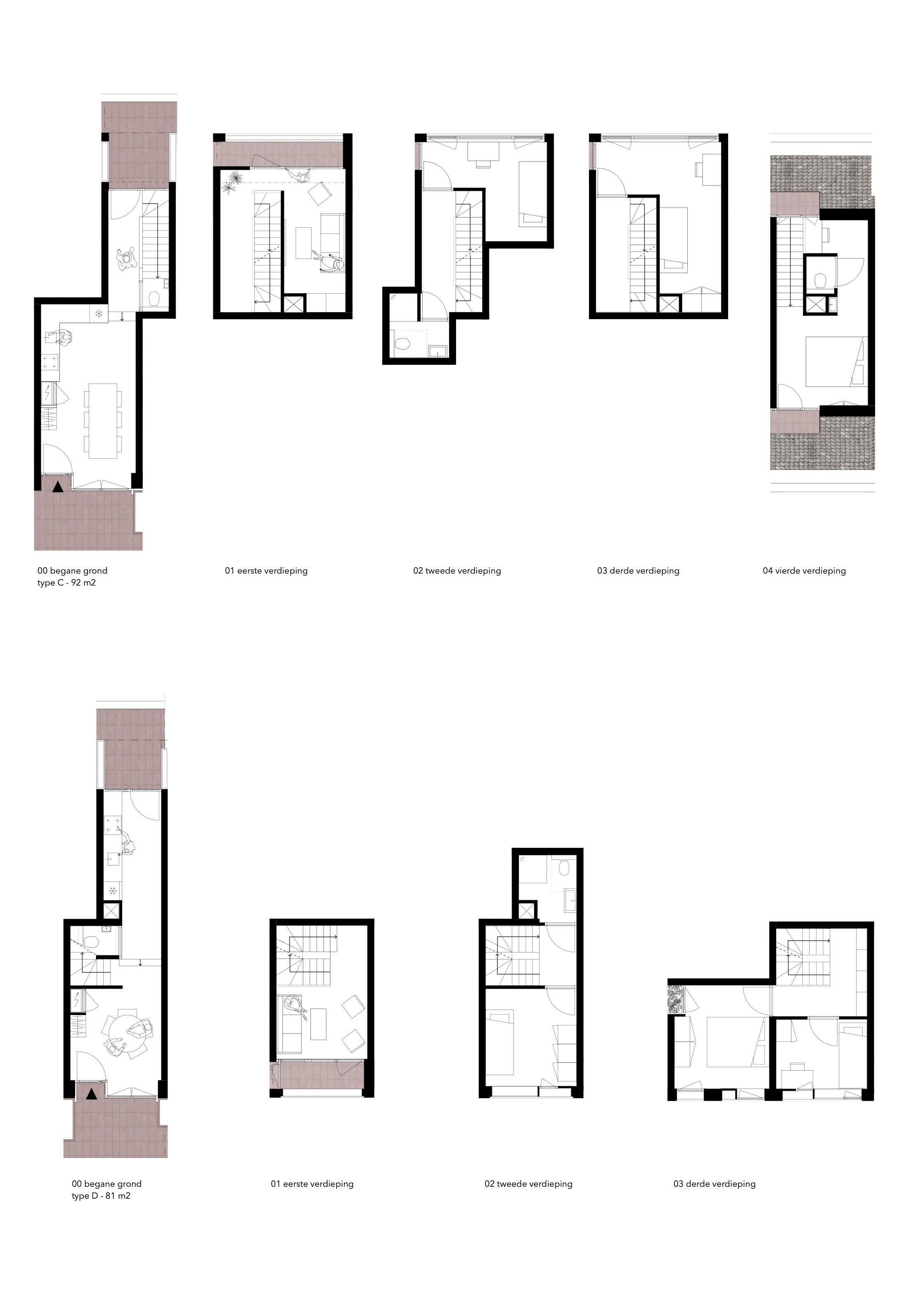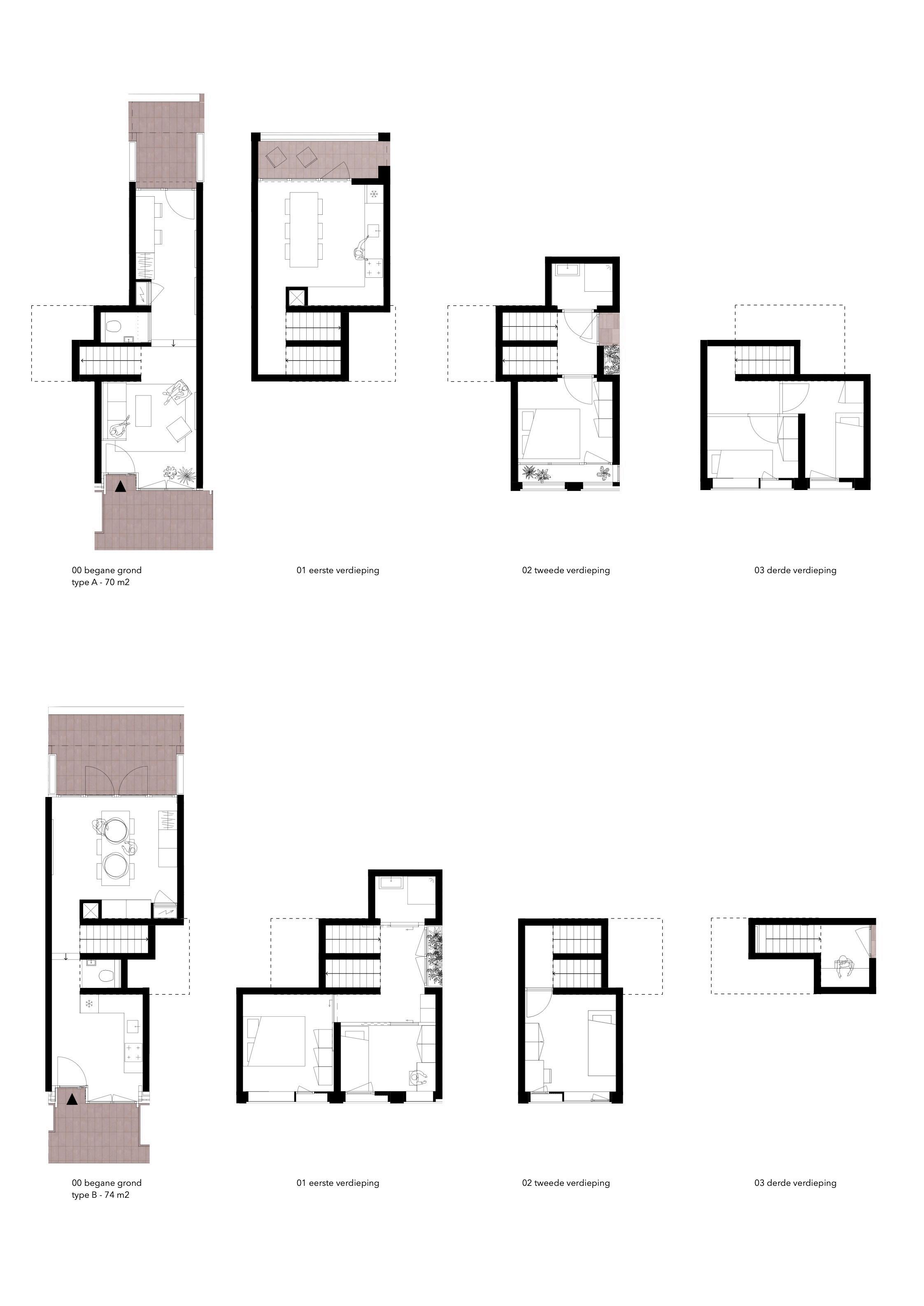 4 unieke gezinswoningen over meerdere lagen met ontsluiting aan straat en hofzijde