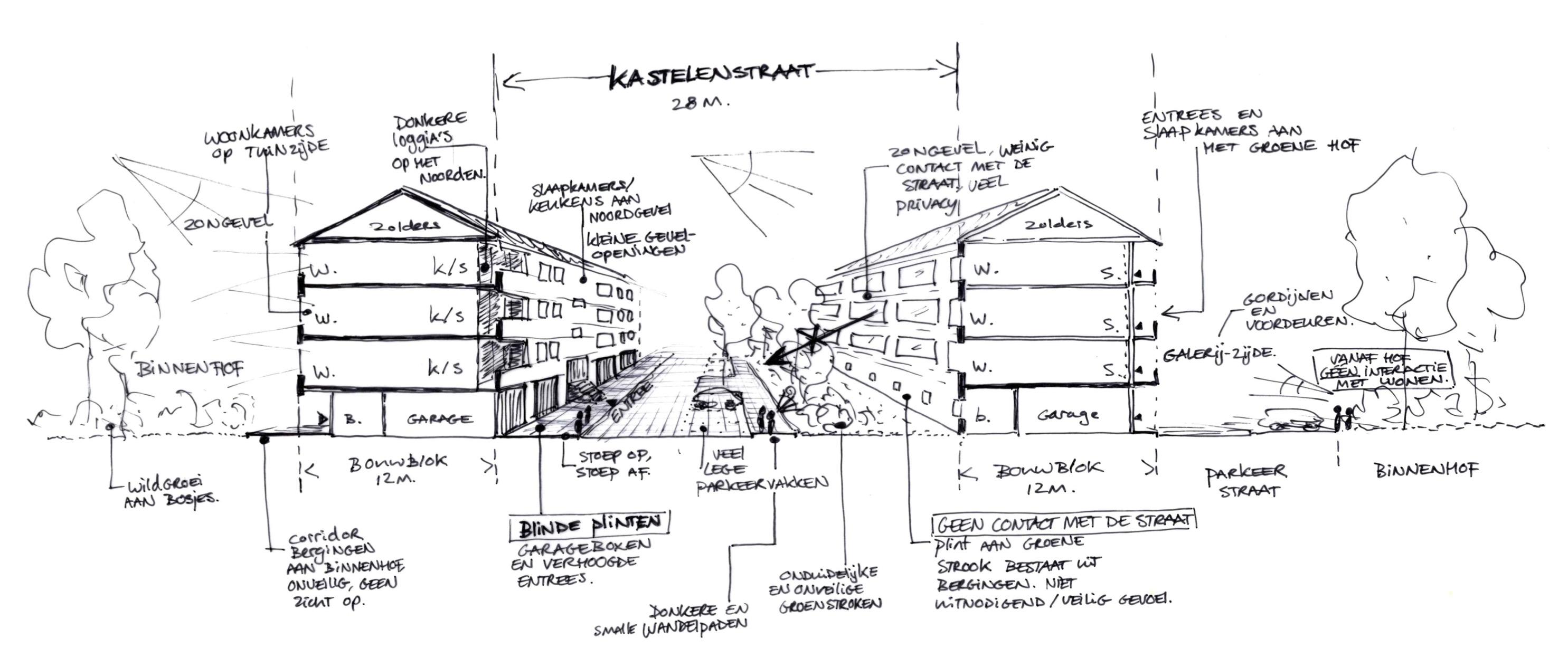 Woonlagen hebben geen directe verbinding met het leven op straat en het hof, hoven nodigen niet uit om erdoorheen te lopen, geen contact met bewoners uit de andere hoven.