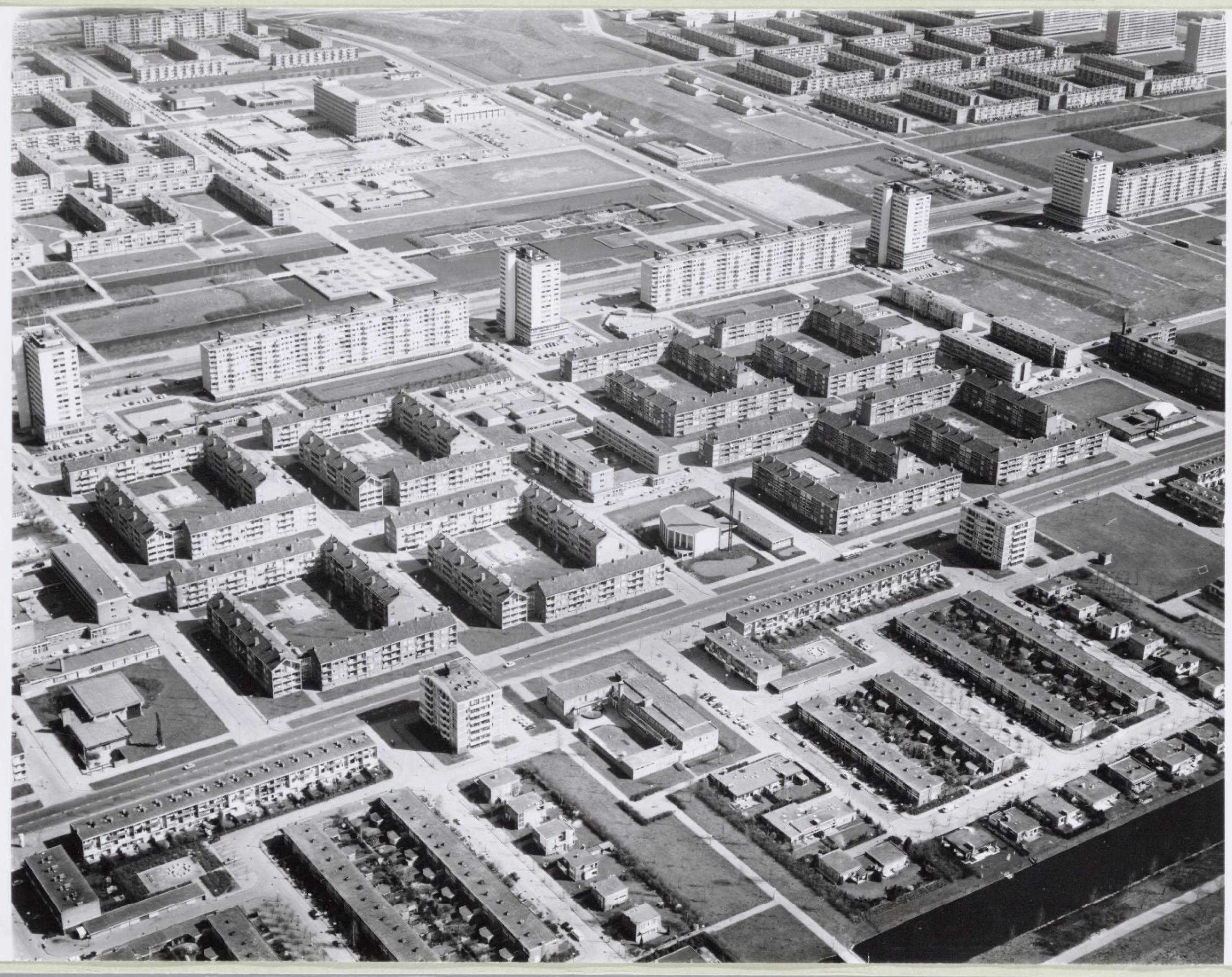 Brede groenstroken en brede stoepen vloeien in elkaar over, geen gevoel van eigenaarschap over de publieke ruimte, de ruimte wordt door niemand gebruikt.